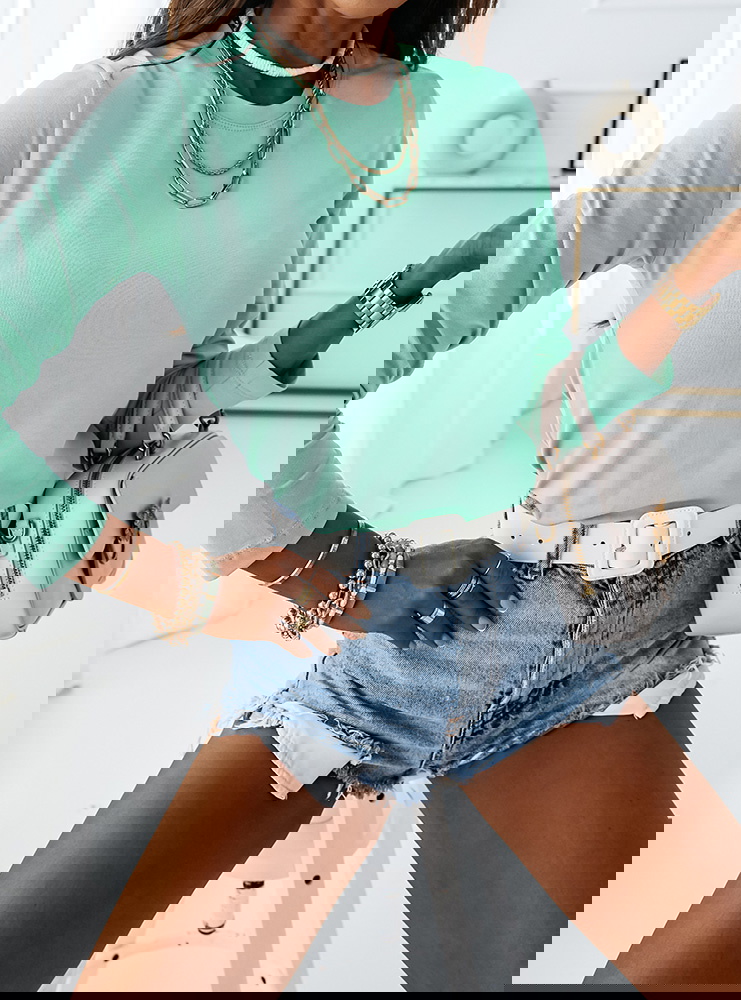 Miętowa klasyczna bluzka z długim rękawem Arelies bluzka jest z gładkiego i przyjemnego materiału dzięki czemu z pewnością będziesz czuła się w niej komfortowo. Dzięki temu, że materiał jest gładki z pewnością możesz dobrać swój ulubiony łańcuszek który będzie idealnym uzupełnieniem.
