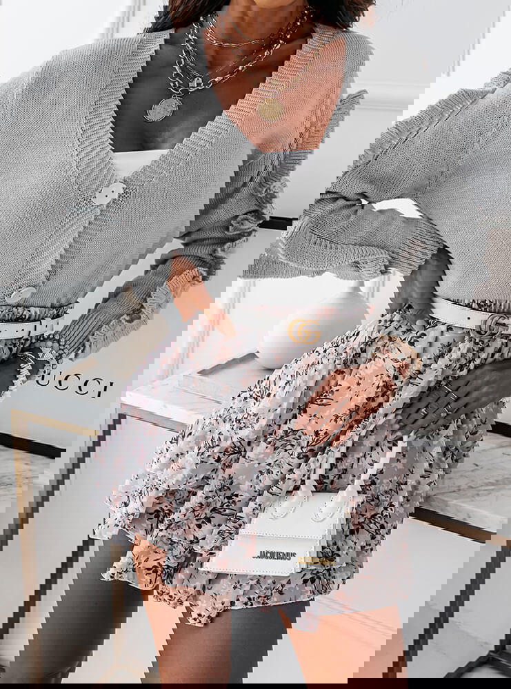 Szary sweter zapinany z falbanką na rękawie Rominaa mamy do czynienia z najmodniejszym w tym sezonie wzorem sweterku. Nie zastanawiaj się długo, juz powinnaś mieć go w swojej szafie.