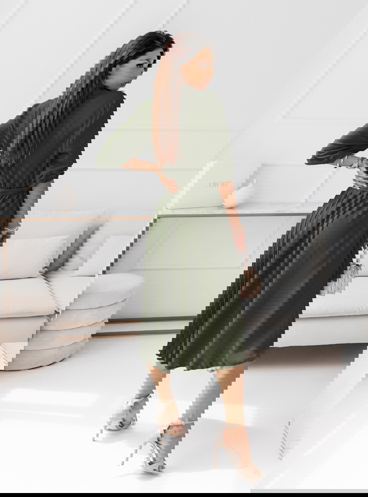 Plisowana sukienka z paskiem Alreta- khaki posiada plisowany dół dzięki czemu dodaje elegancji i klasy tej sukience. Sukienka posiada również pasek w talii i kołnierzyk charakterystyczny dla elegancji. Zdecydowanie powinnaś mieć ją w swojej szafie, nie wiesz kiedy ci się przyda.