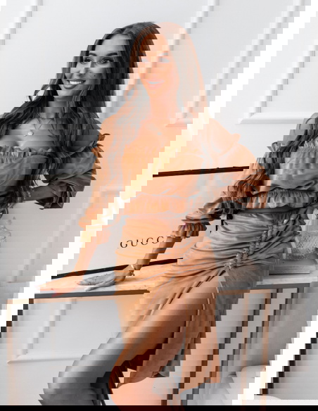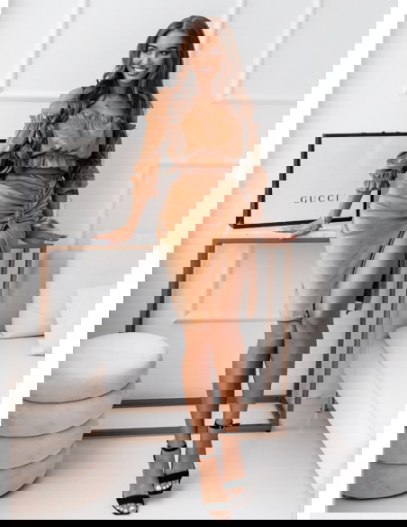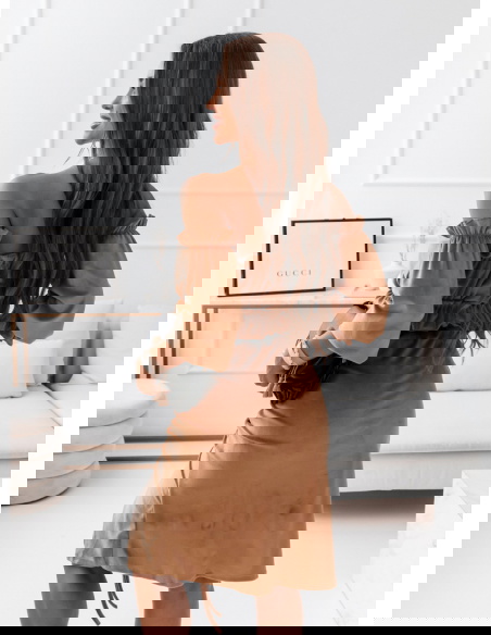 Karmelowy welurowy komplet spódniczki z rozcięciem i hiszpanką Venetta spódniczka posiada bardzo kobiece rozcięcie na nodze z wiązaniem i marszczeniem, a krótki top jest w stylu hiszpanki.