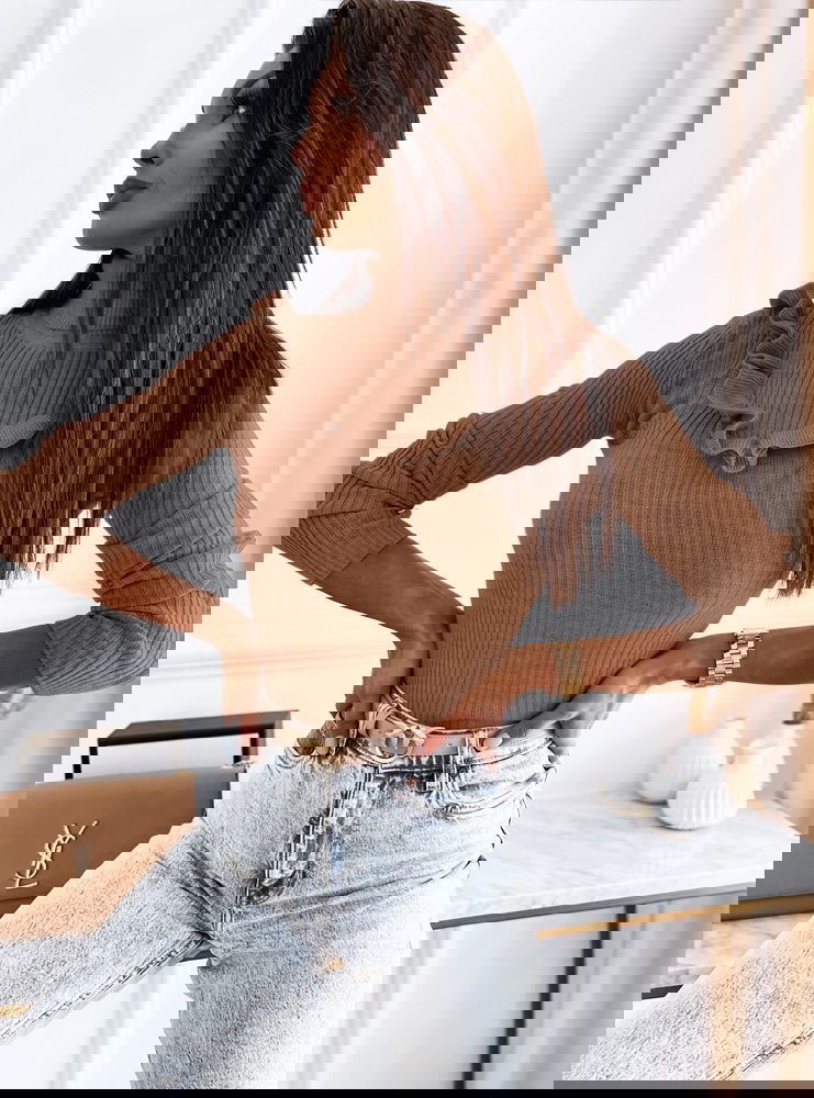 Karmelowy prążkowany sweter z golfem i ozdobną falbanką Kirma dopasowane spodnie sprawdza się idealnie do całej stylizacji z tym sweterkiem.