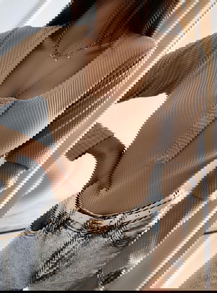 Beżowa bluzka prążkowana z odpinanym dekoltem Morris to będzie twój must have w szafie, możesz nałożyć go wszędzie gdzie tylko chcesz.