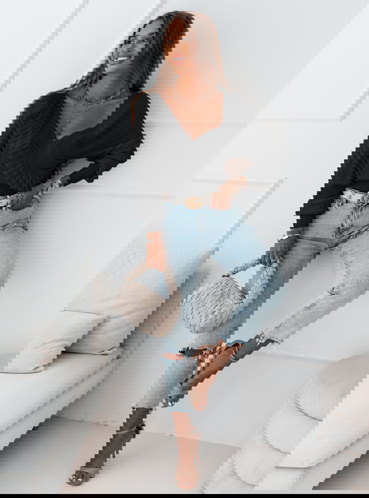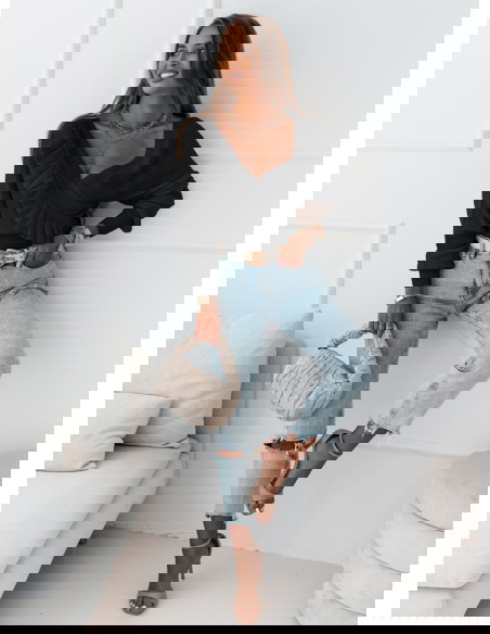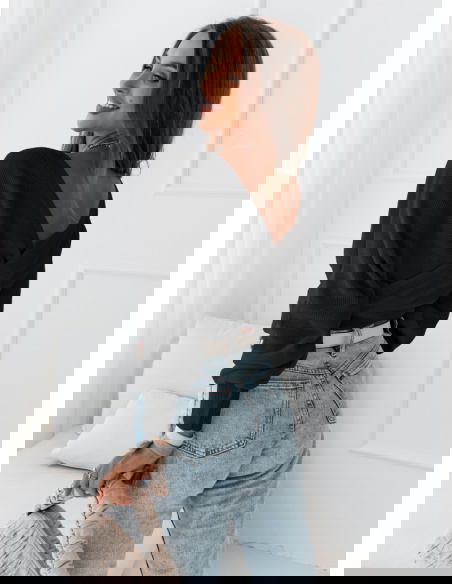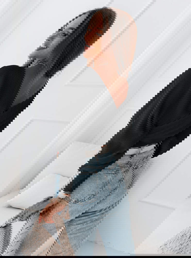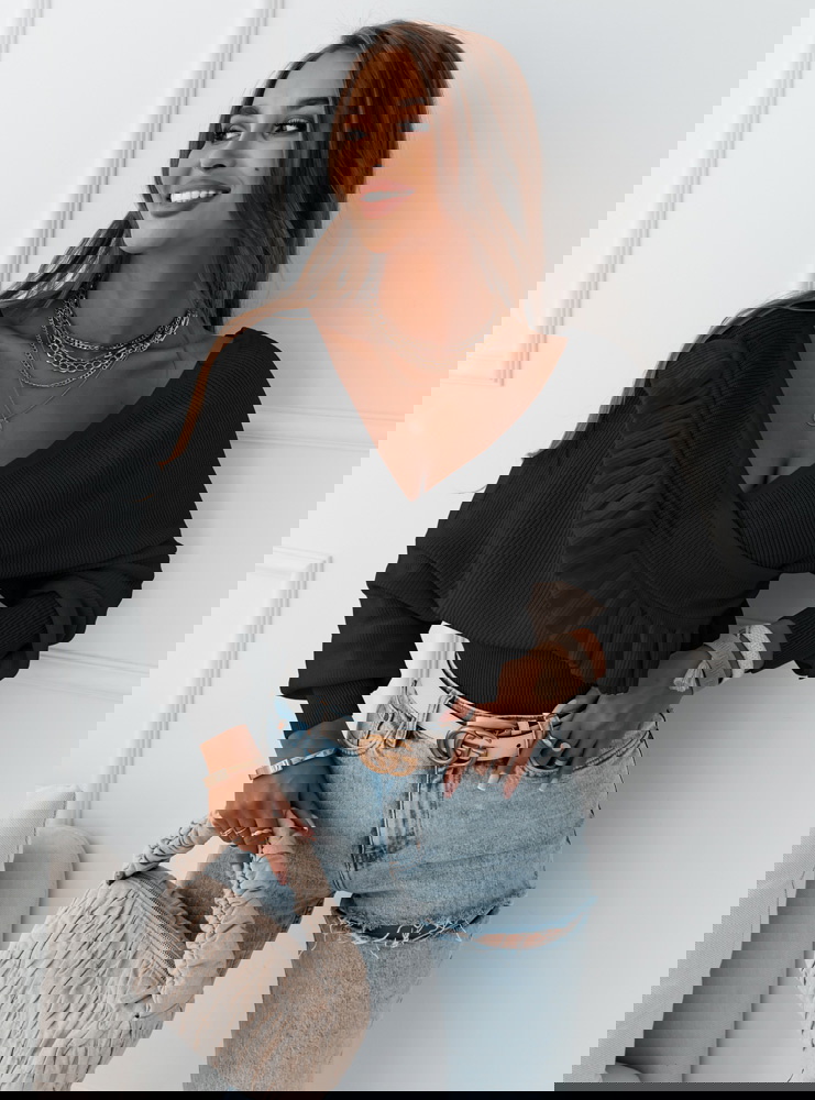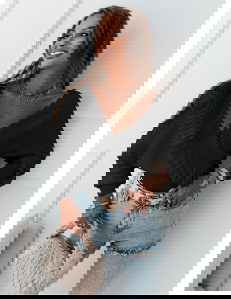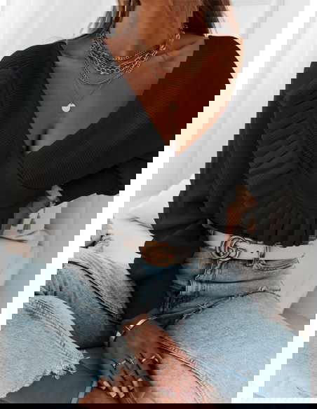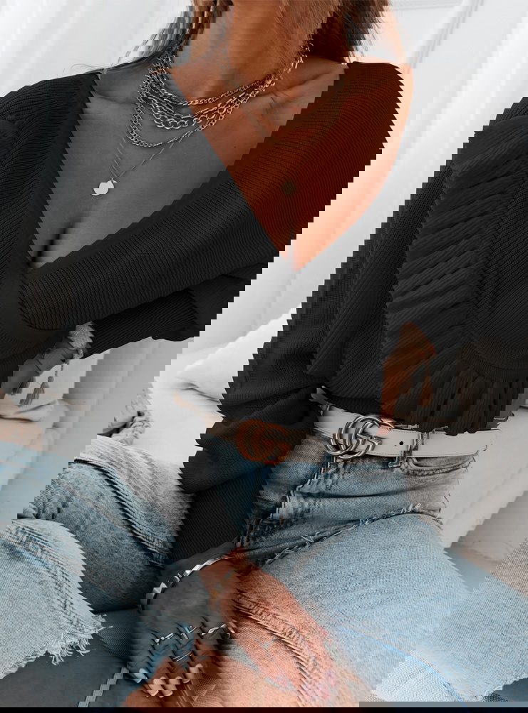 Czarny sweterek z przekładanym dekoltem i ozdobną falbanką Shazza założysz zarówno do spodni jak i do spódniczki. Pokaż swój styl i stwórz go tak jak lubisz.