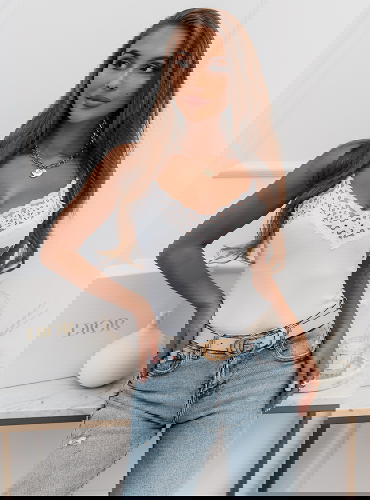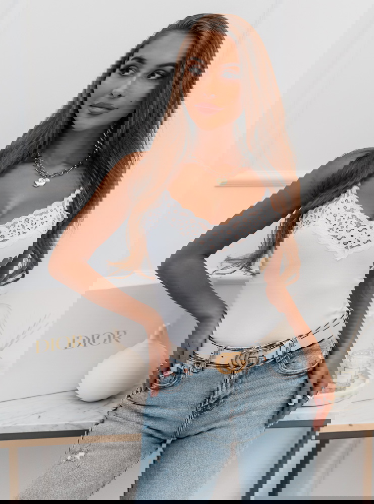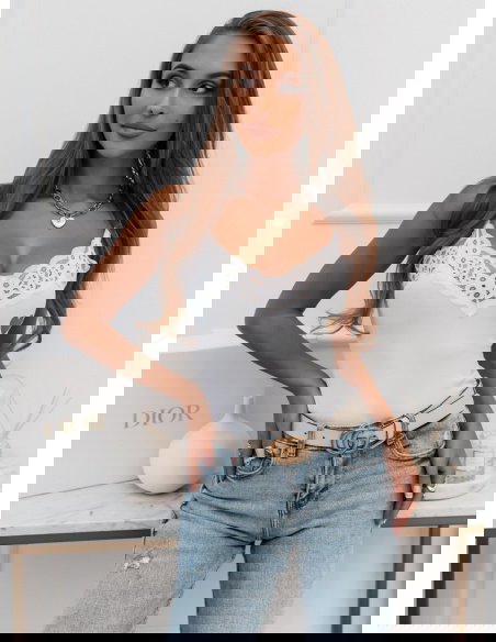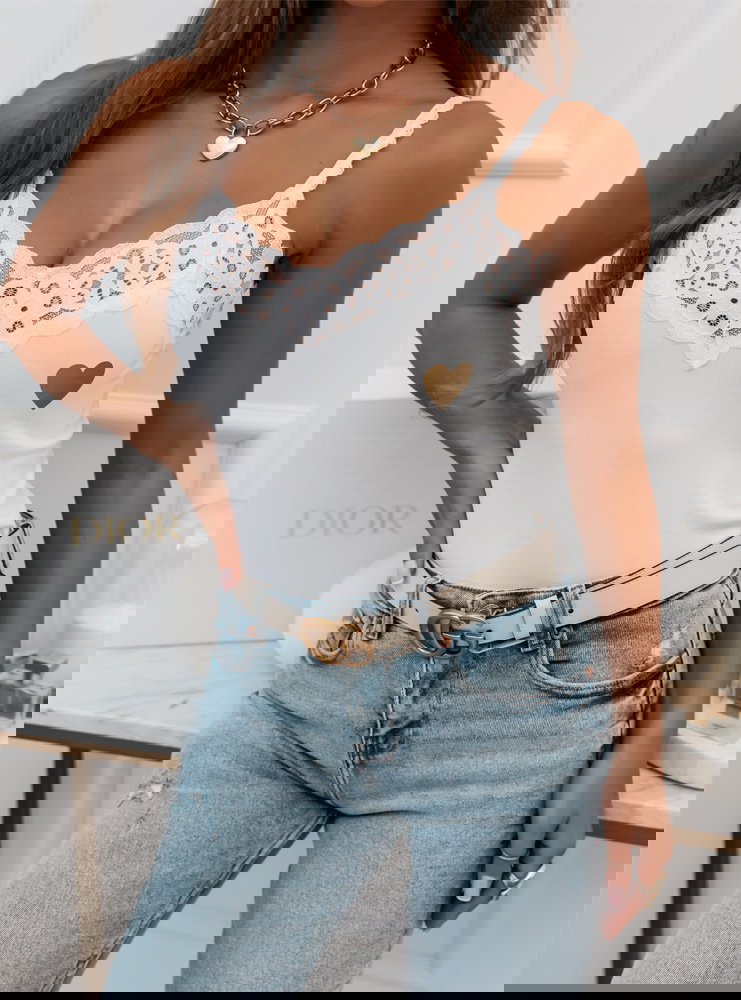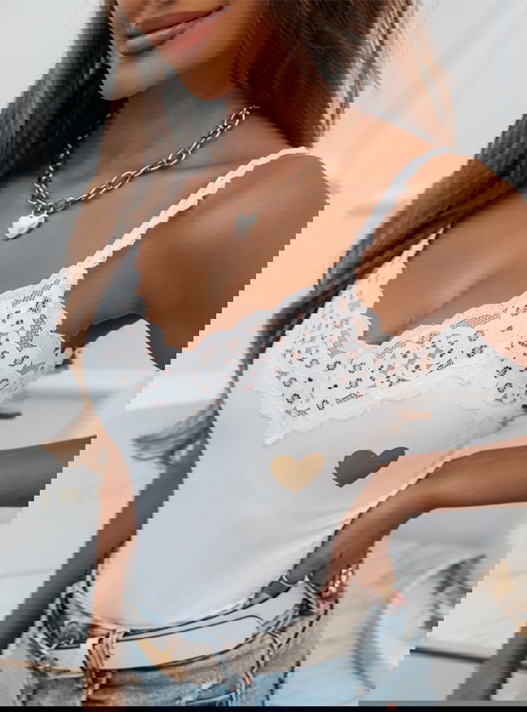 Klasyczna bluzeczka na cieniutkich ramiączkach z ozdobna koronką to świetna baza do wielu stylizacji. Bluzeczkę uzupełnia delikatny złoty nadruk z serduszkiem.