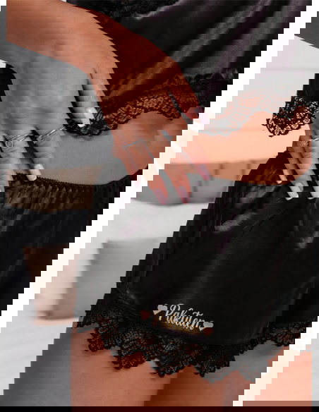 Czarna satynowa logowana piżama koszulka + szorty Majaa piżamka może być rownież kobieca i pięknie się prezentować a jednocześnie jest wygodna, zapewni ci komfort podczas snu.