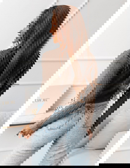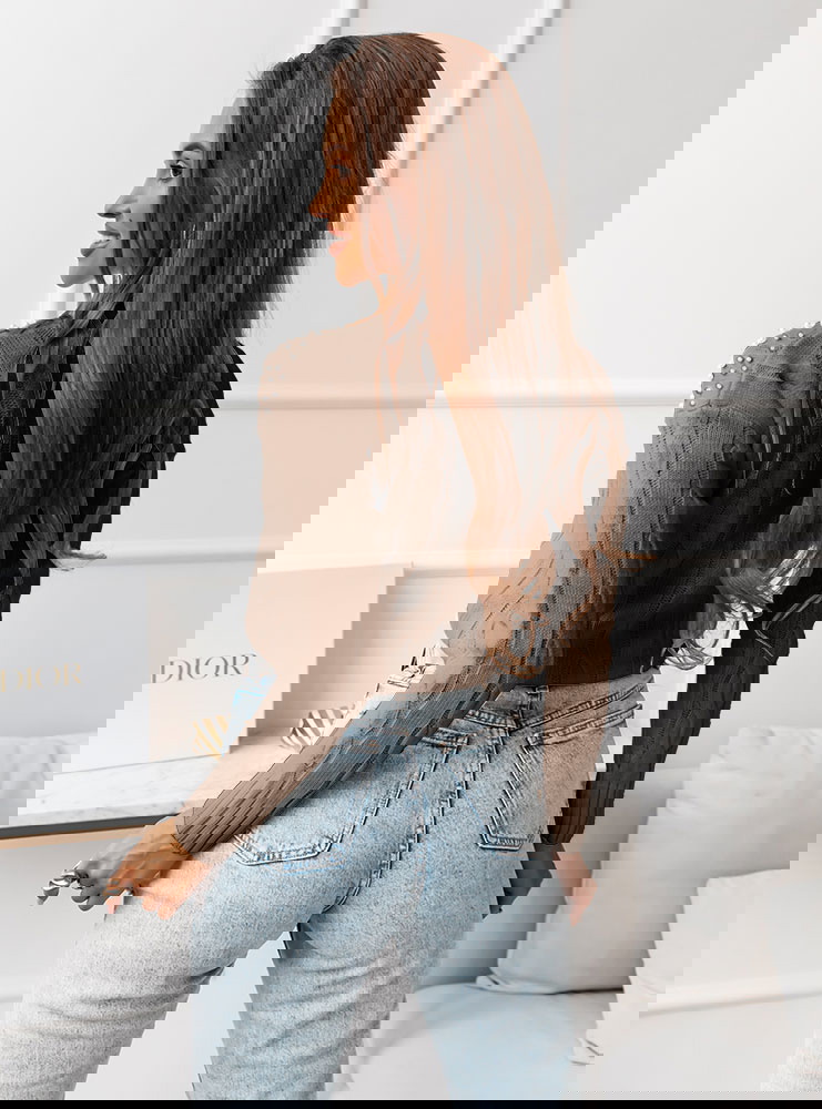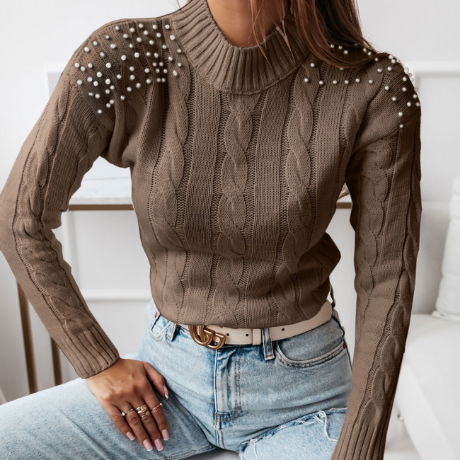 Idealnie dopasowany sweterek a jednocześnie sweterek z ozdobnym splotem i perełkami na ramionach. Sweterek prezentuje się bardzo zachwycająco i z pewnością przykuje waszą uwagę.