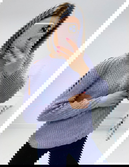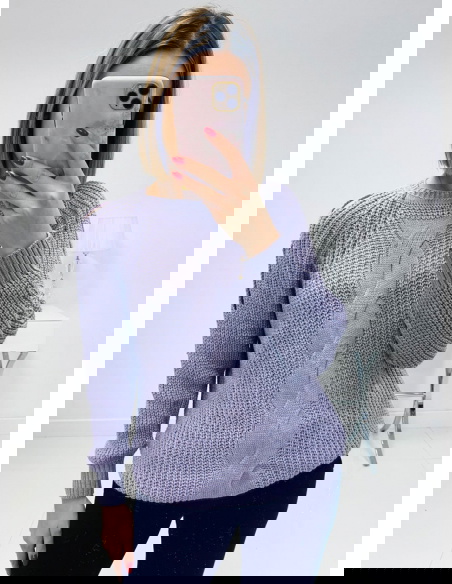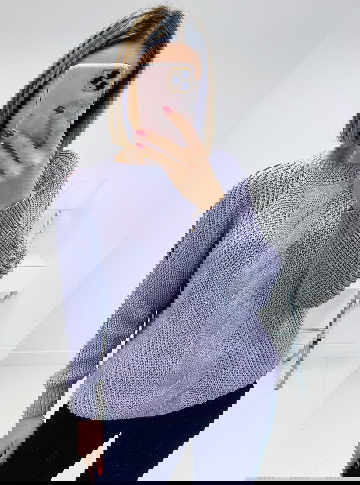 Piękny liliowy sweterek z ozdobnym splotem i wycięciami na rękawach.