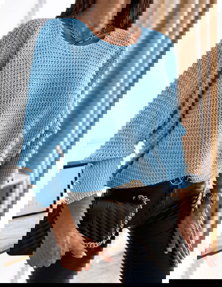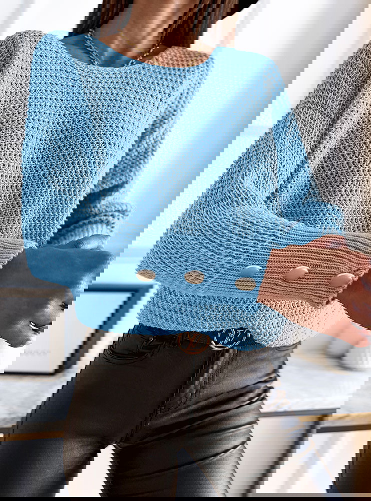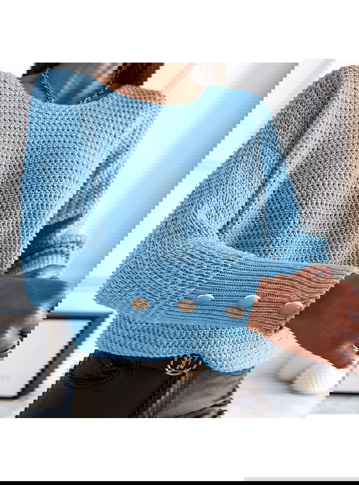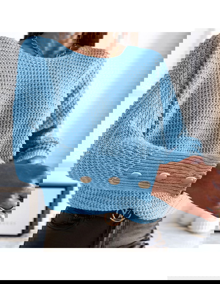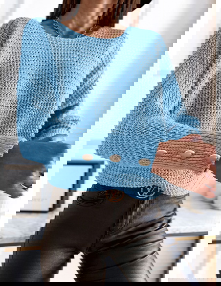 Błękitny sweterek z ozdobnymi guziczkami na rękawach Wiolii