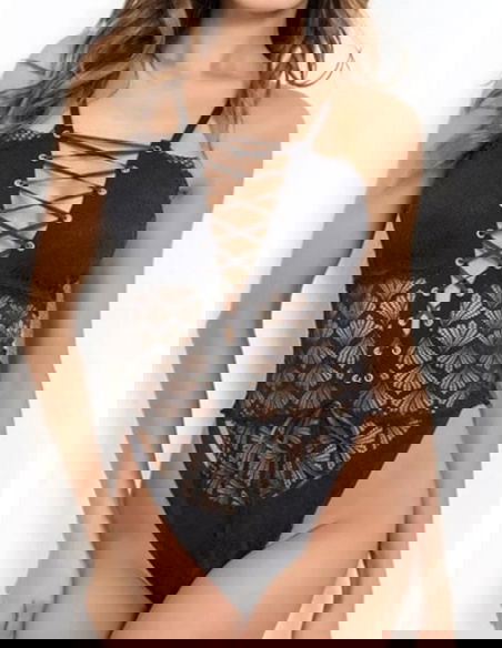 Czarne koronkowe body z ozdobnym sznurowaniem Billo