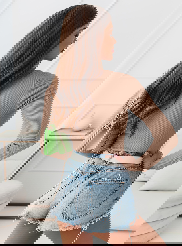 Bezowa prążkowana bluzka z dekoltem Alioo wykonana została z prążkowanego materiału, który jest bardzo przyjemny i nie podrażnia skóry.