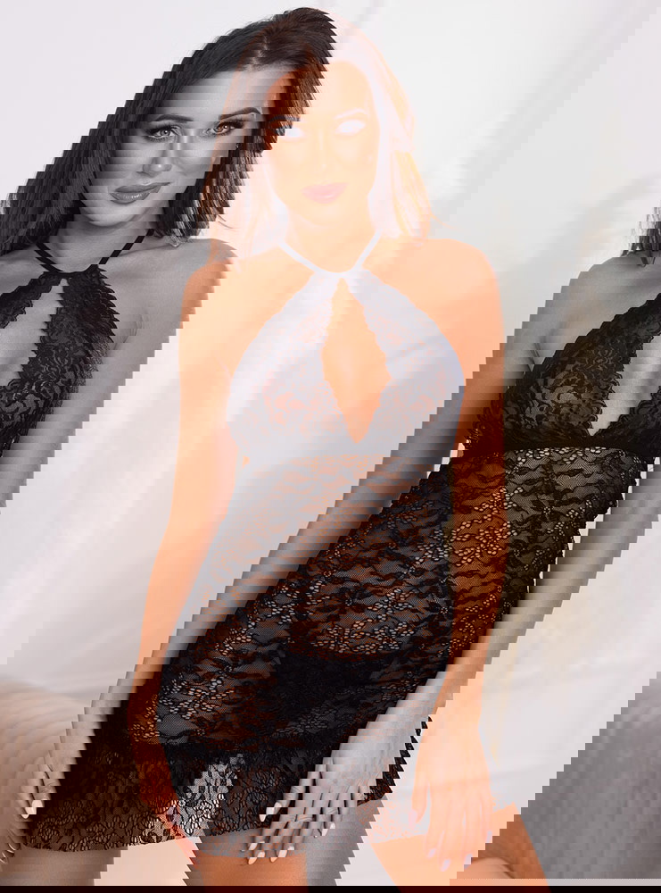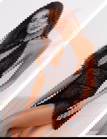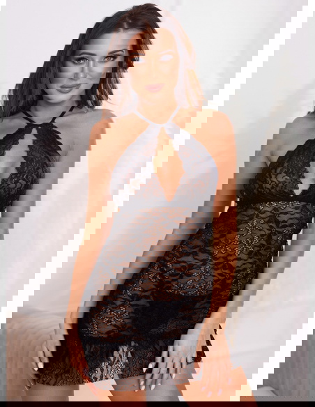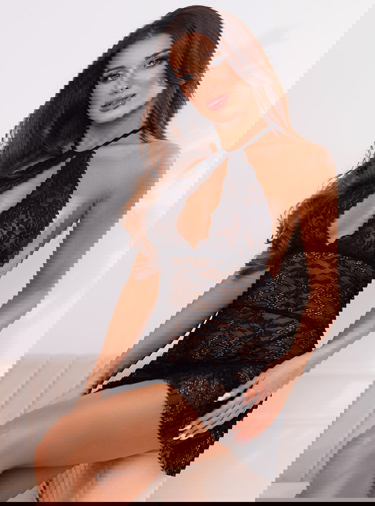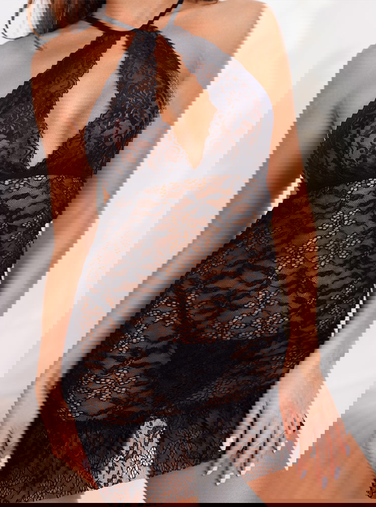 Czarny koronkowy zestaw bielizny koszulka+stringi Ezza podkreśli twoje atuty kobiecości w nim poczujesz się kobieco, nie może zabraknąć go w twojej szafie .
