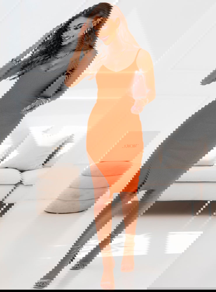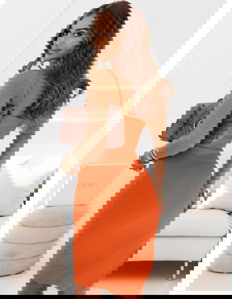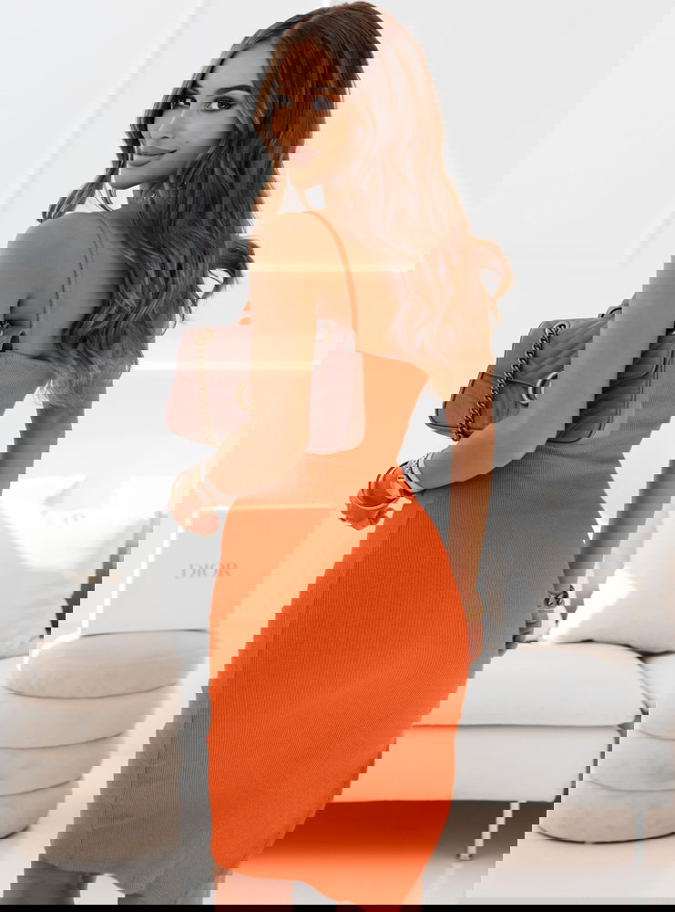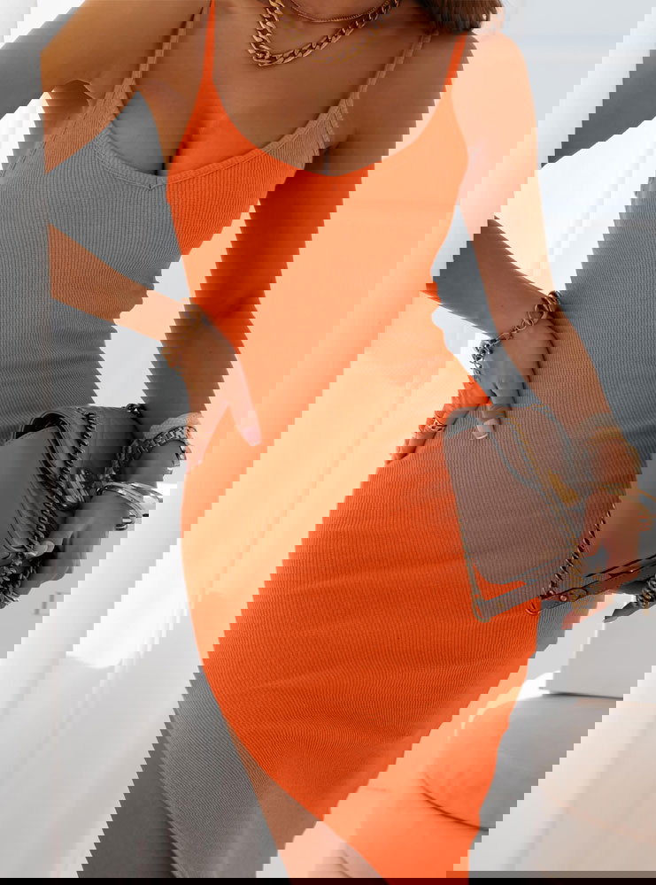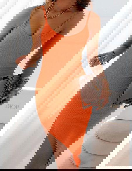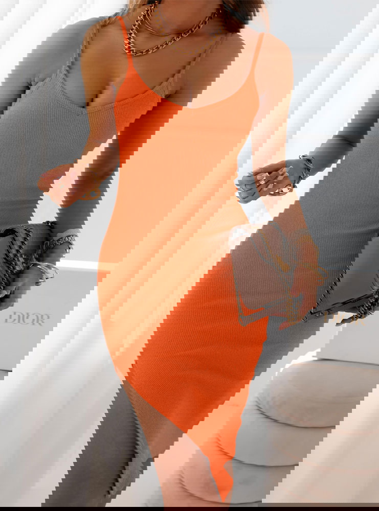 Pomarańczowa prążkowana sukienka na ramiączkach z rozporkiem Anakin do bardzo seksowny i mody krój sukienki który dopasujesz do siebie.
