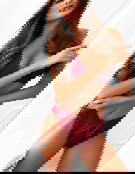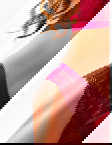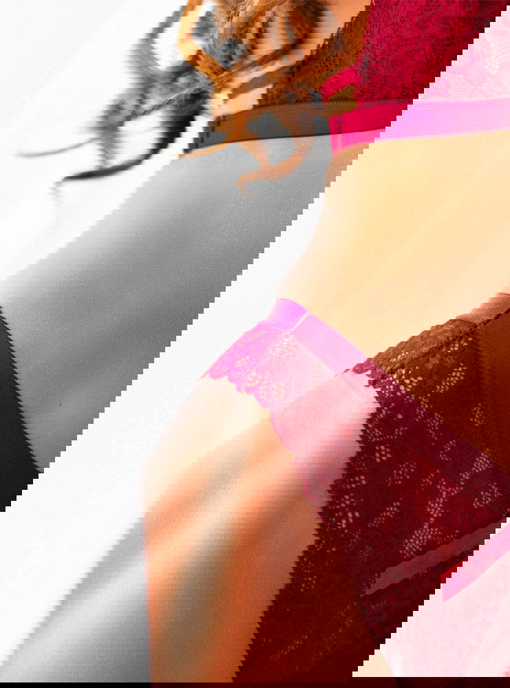 Bordowy komplet koronkowej bielizny biustonosz+majtki Amorii Obniżony dół jest idealnym połączeniem z majtkami – równie ozdobnymi. Uszyte są, prócz koronki, z oddychającego, materiału.