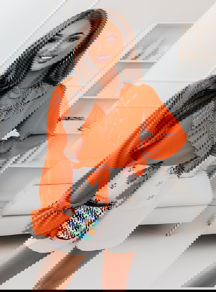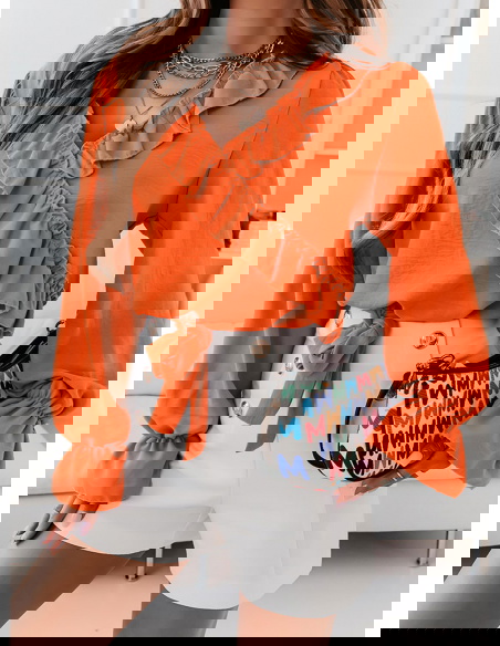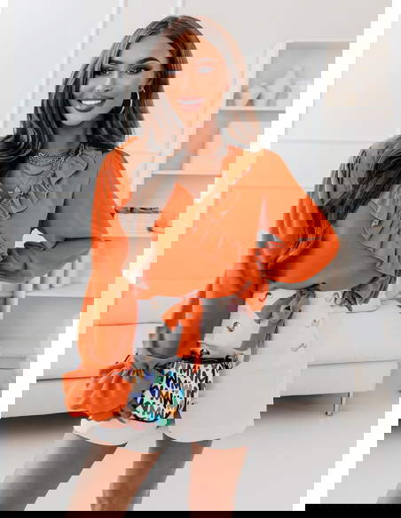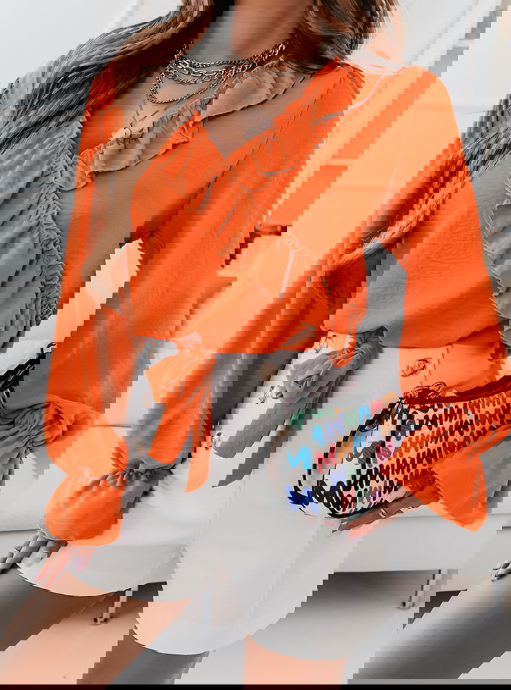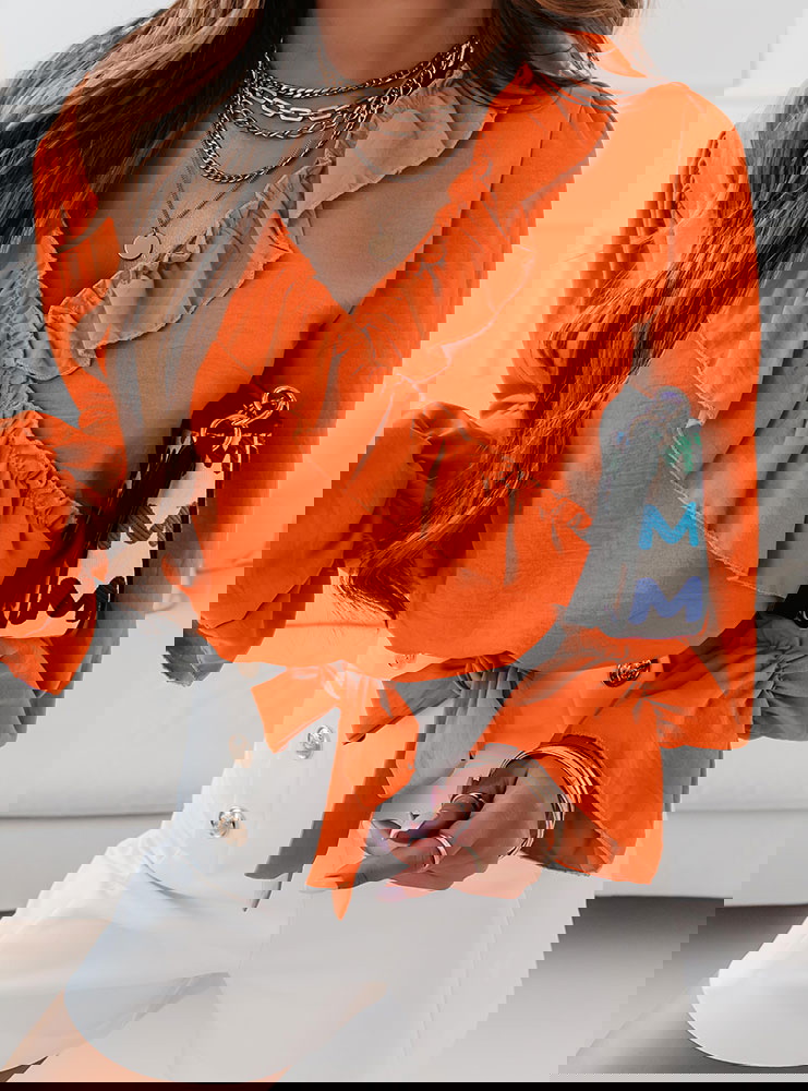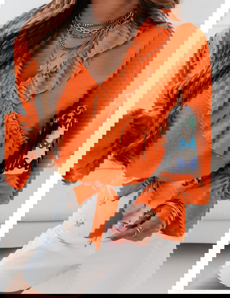 Pomarańczowa bluzka z falbankami przy dekolcie Gettalia