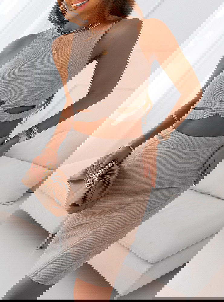 Beżowy prążkowany komplet top+spódnica Gertta będziesz go mogła ubrać na wiele okazji.