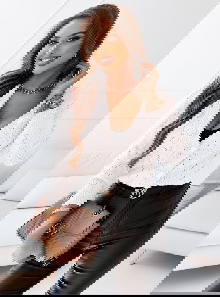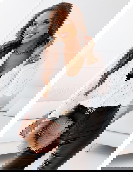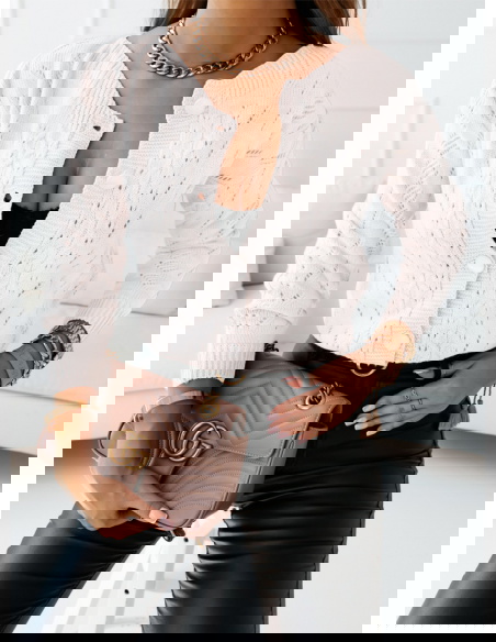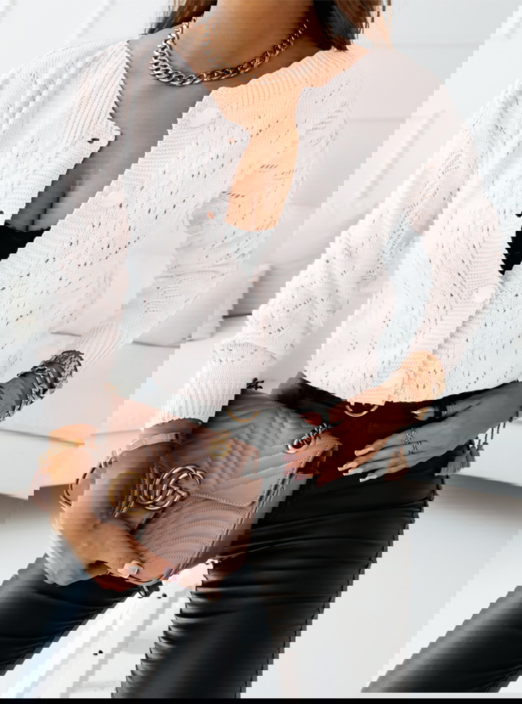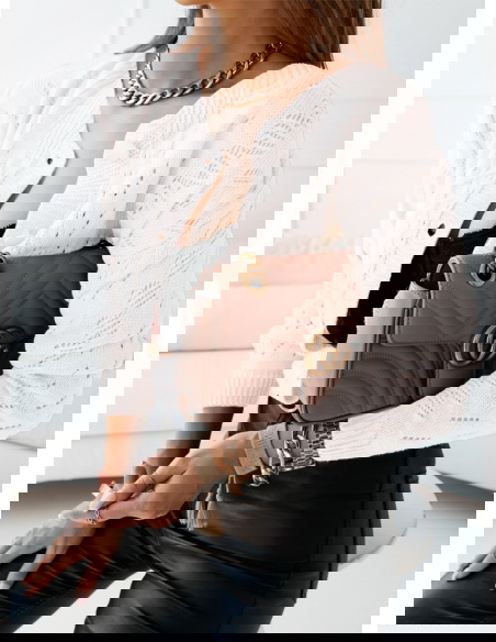 Klasyczny sweterek zapinany na guziki z ażurowym splotem w kolorze ecru będzie pasował do każdej codziennej stylizacji. Będzie świetnie nie prezentował z czarnymi spodniami.