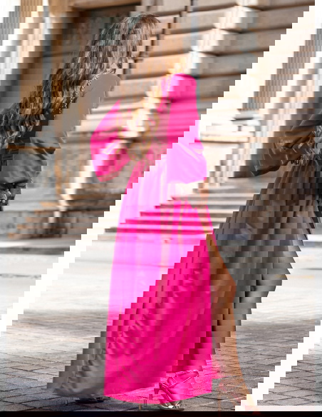 Długa sukienka z rozporkiem Corlena - fuksja to model który z pewnością skradnie Twoje serce, więc z pewnością pojawi się w Twojej garderobie. Must have !