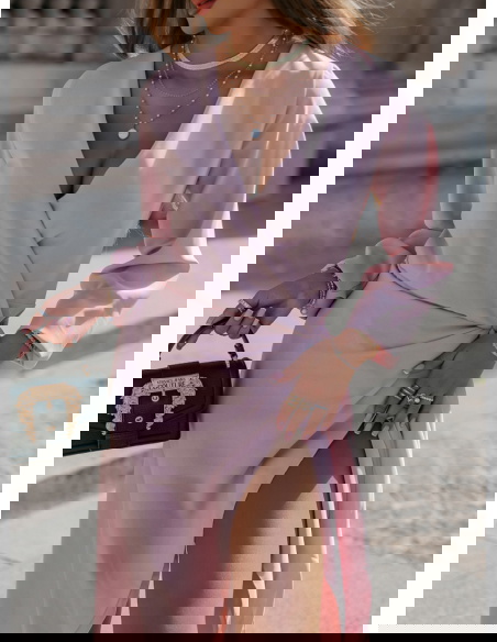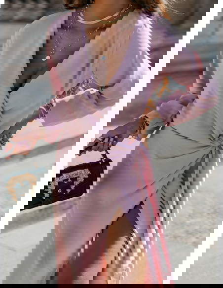Pudrowa sukienka z przekładnym dekoltem i wiązaniem Collena - to propozycja która skradnie Twoje serce . Niech zagości u Ciebie w szafie !