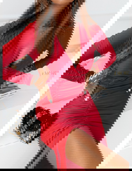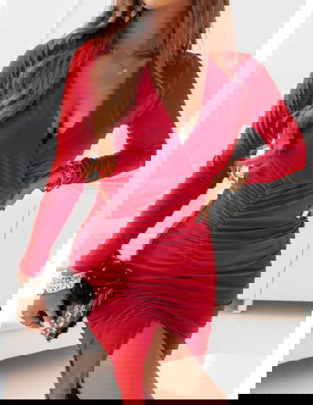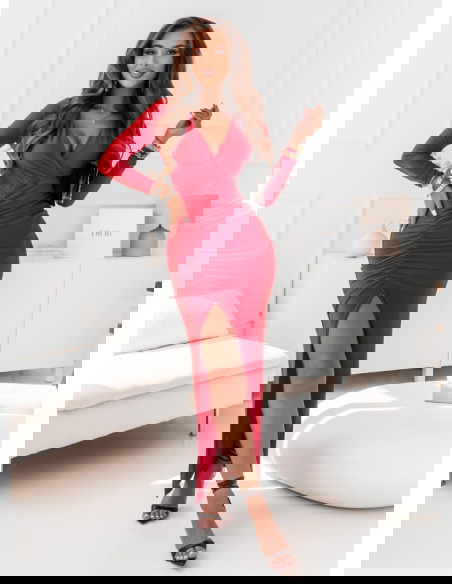 malinowa długa sukienka z marszczeniem i przekładanym dekoltem Artie super wygląda i przepięknie podkreśli wszystkie twoje kształty.