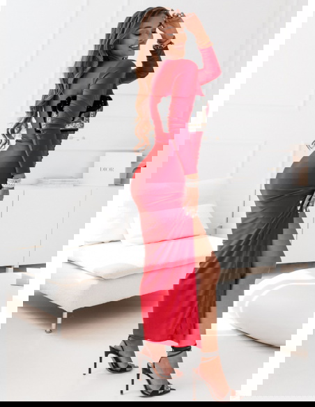 Malinowa długa sukienka z marszczeniem i przekładanym dekoltem Artie