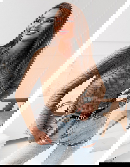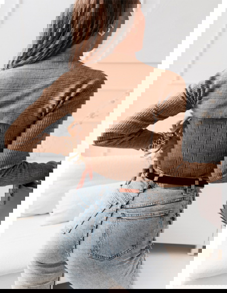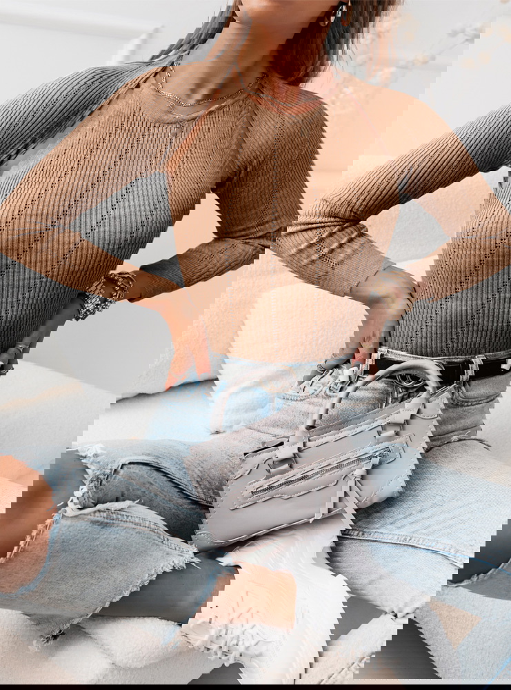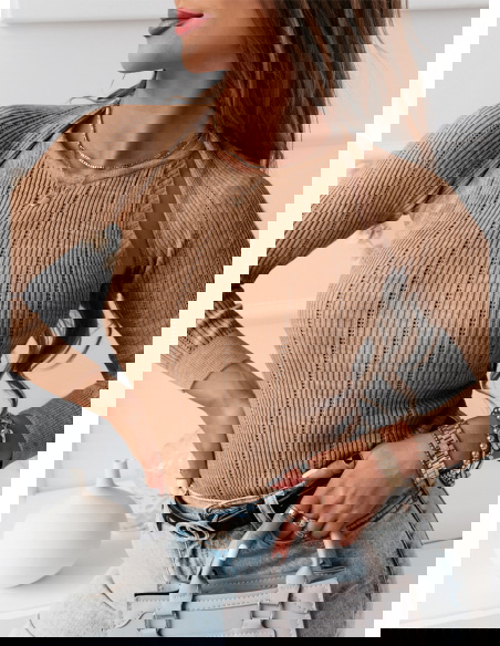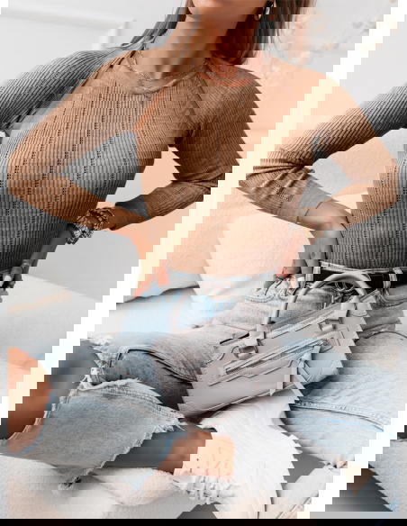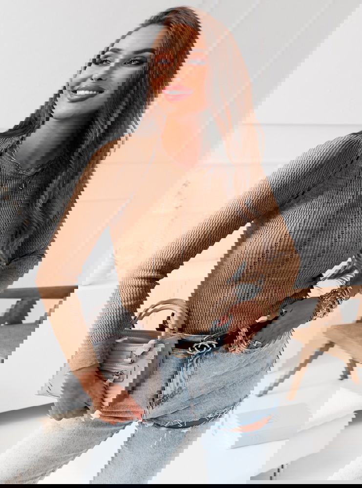 Karmelowa sweterkowa bluzka z bolerkiem Derolla to styl w cudownej odsłonie o jesiennych brązach .Pokochaj nasze inspiracje i niech już dziś będą w drodze Ciebie.