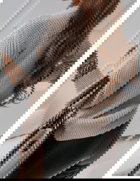 Beżowy sweter z perełkami i przeplotem Rossie fajnie skompletujesz go ze spodniami czy ze spódniczką, twórz stylizacje jakie tylko chcesz.
