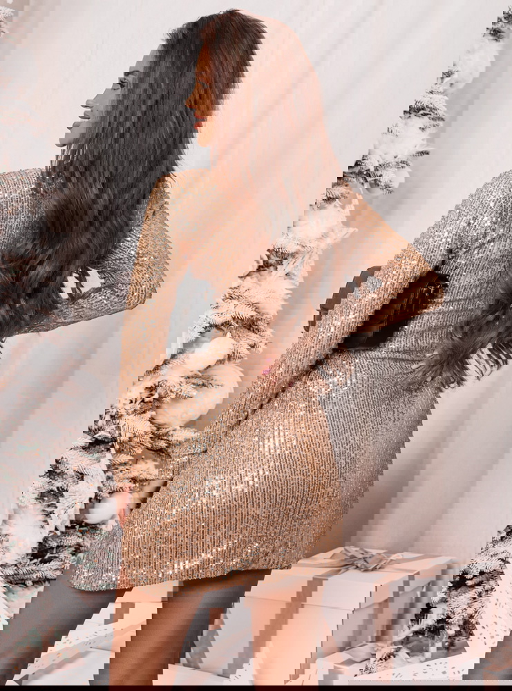 Złota cekinowa sukienka z przekładanym dekoltem Netella a to propozycja dla kobiet z klasą , niebojących się odważnych stylizacji .