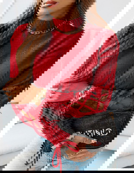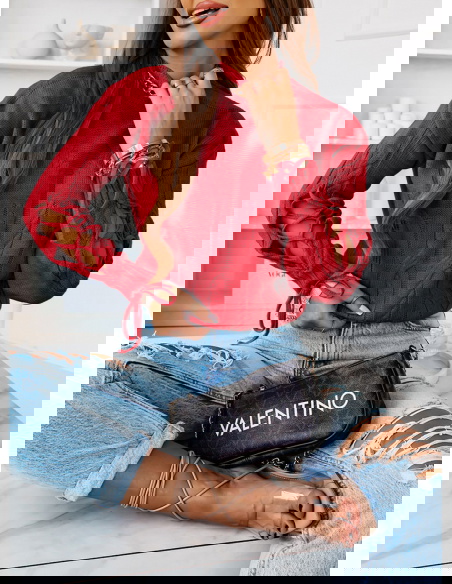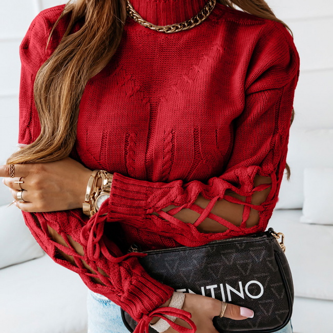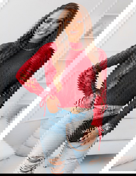 Malinowy sweter z ozdobnym splotem i sznurowaniem na rękawach Loppt to model idealny na zimowy czas, niech dziś ożywi Twoją garderobę. Must have !