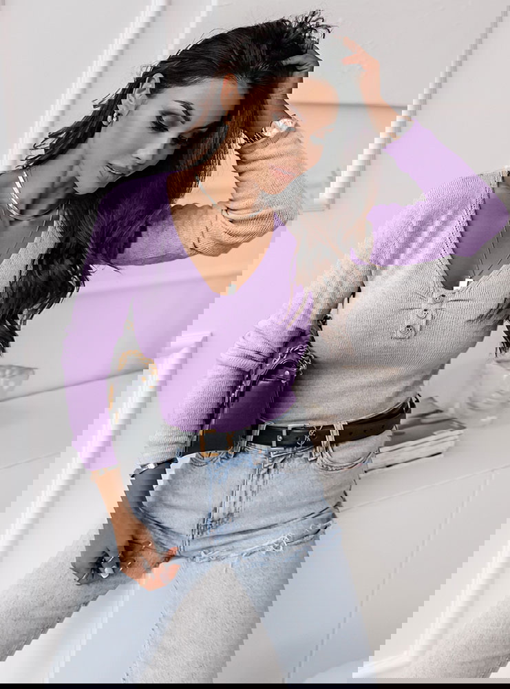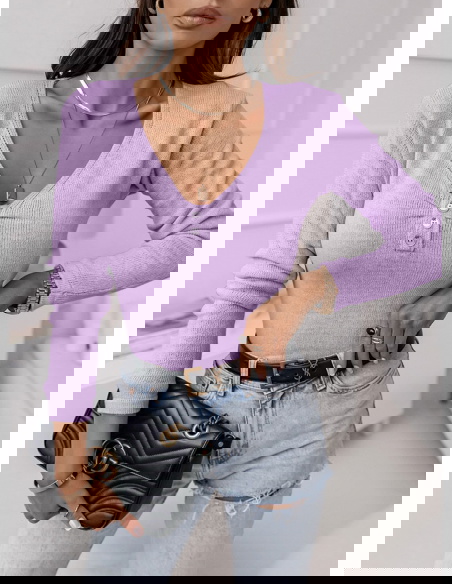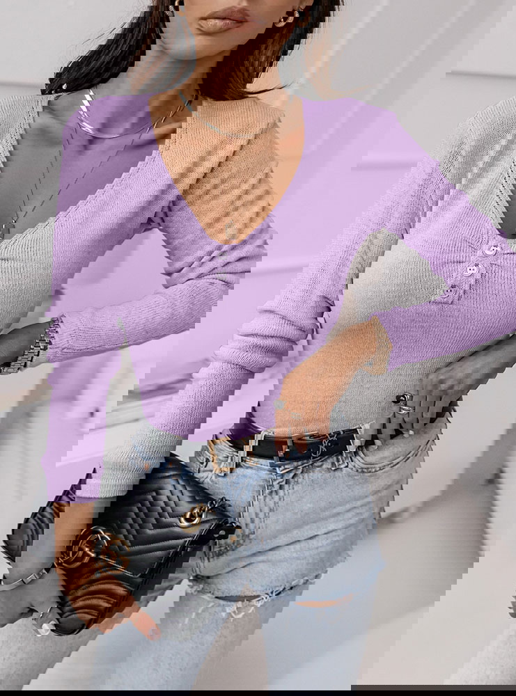 Liliowy sweter z dekoltem w serek i ozdobnymi guzikami Kelletta