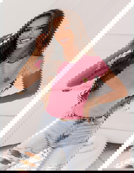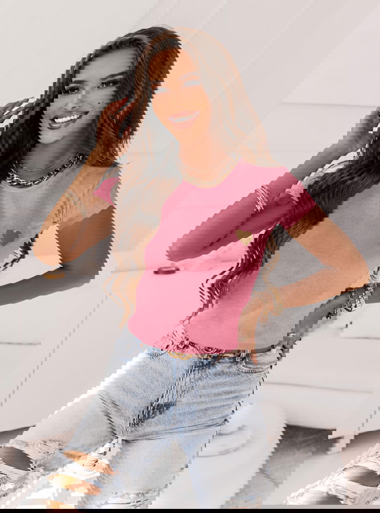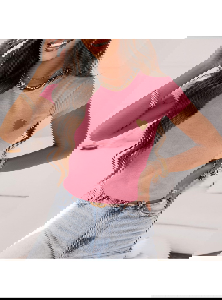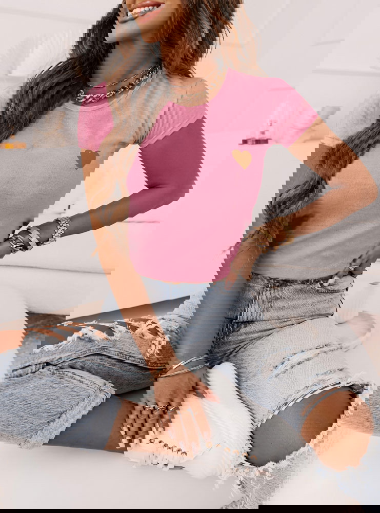 Różowa koszulka na krótki rękaw z ozdobnym nadrukiem Bellisimo to idealna propozycja na stylizację z ulubionymi spodniami.