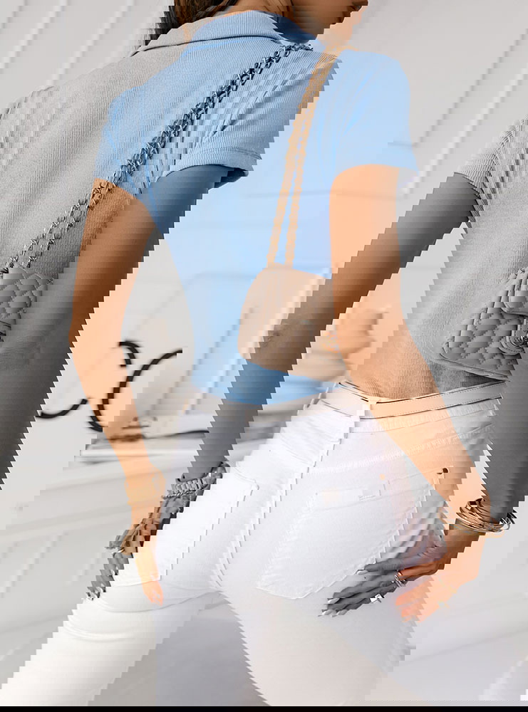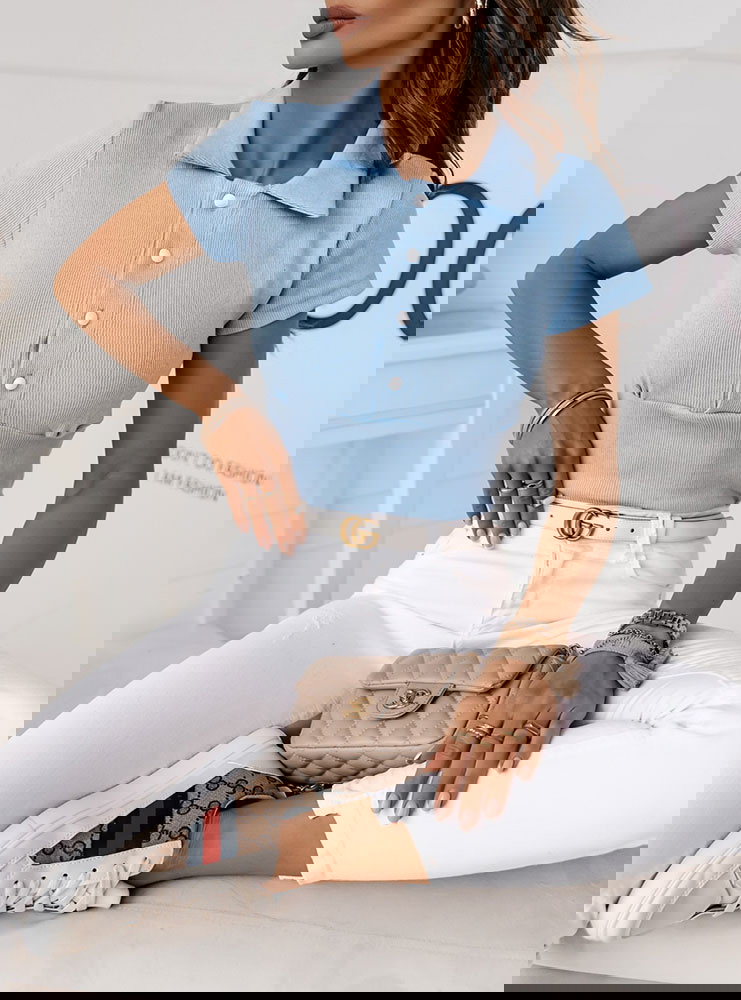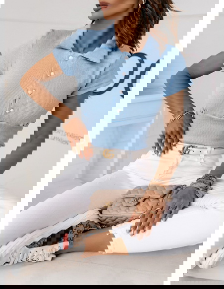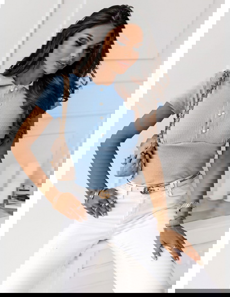 Błękitna bluzka prążkowana z guzikami Dorette idealny pomysł dla każdej kobiety, lubiącej ten kolor i takie bluzeczki.