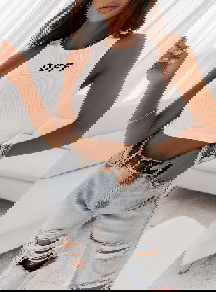 Biały prążkowany crop top z modnym haftem Herinka to propozycja wobec której nie przejdziesz obojętnie , wybierz swój must have i stwórz stylizacje na siłownie.