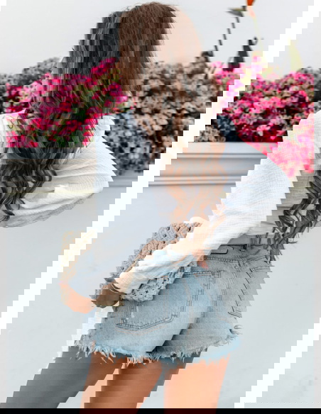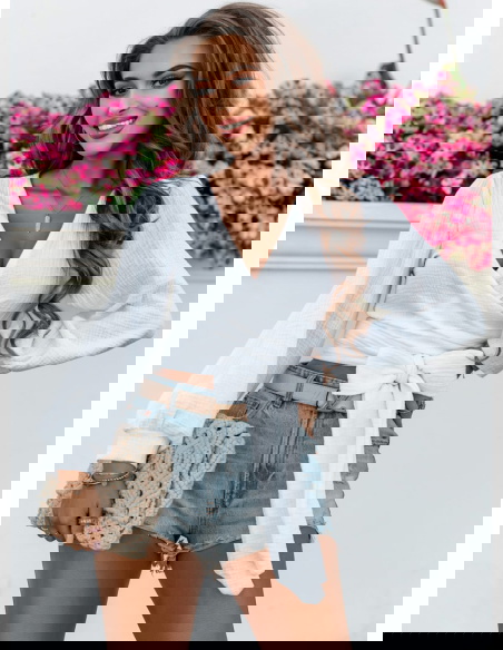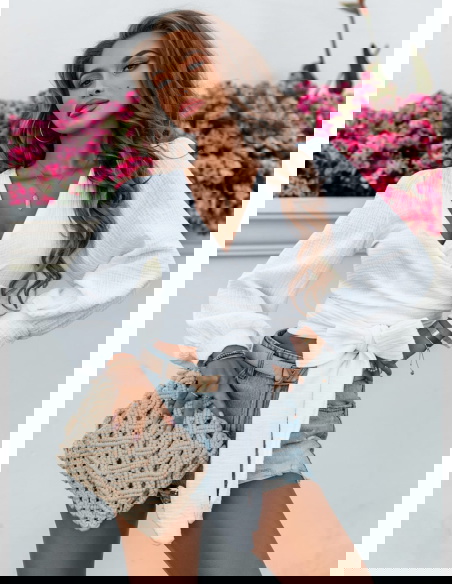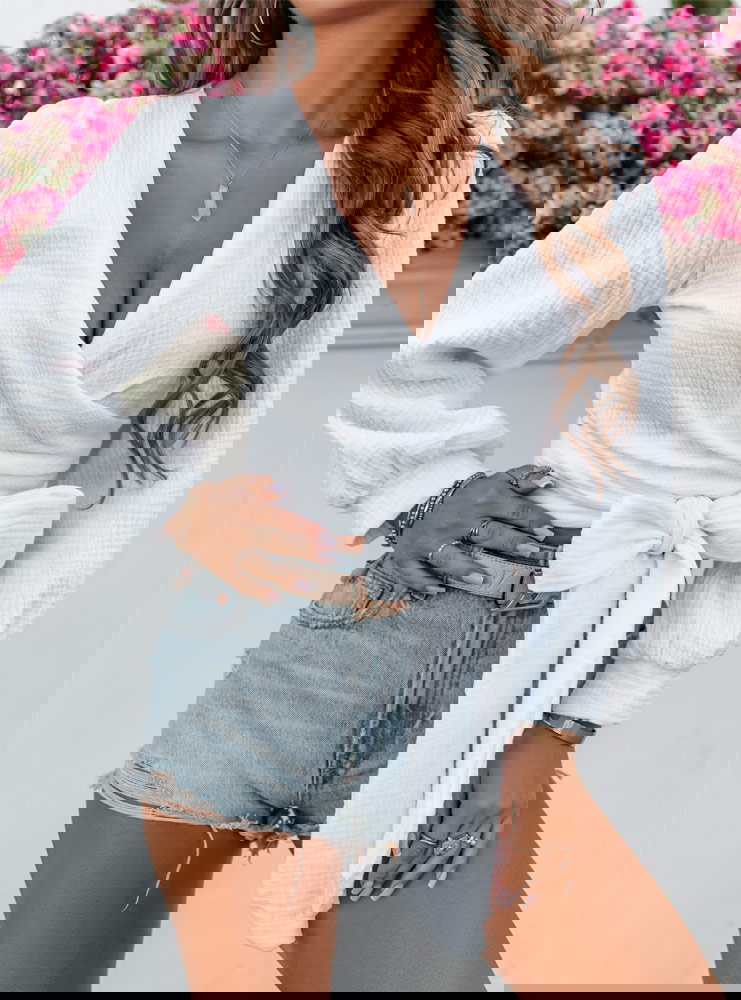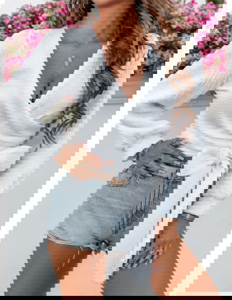 Biała muślinowa bluzka z przekładanym dekoltem Cherii jest niezwykle przyjemna w dotyku. Wybierasz się na randkę? Zatem nie zwlekaj. Ta propozycja jest dla Ciebie.