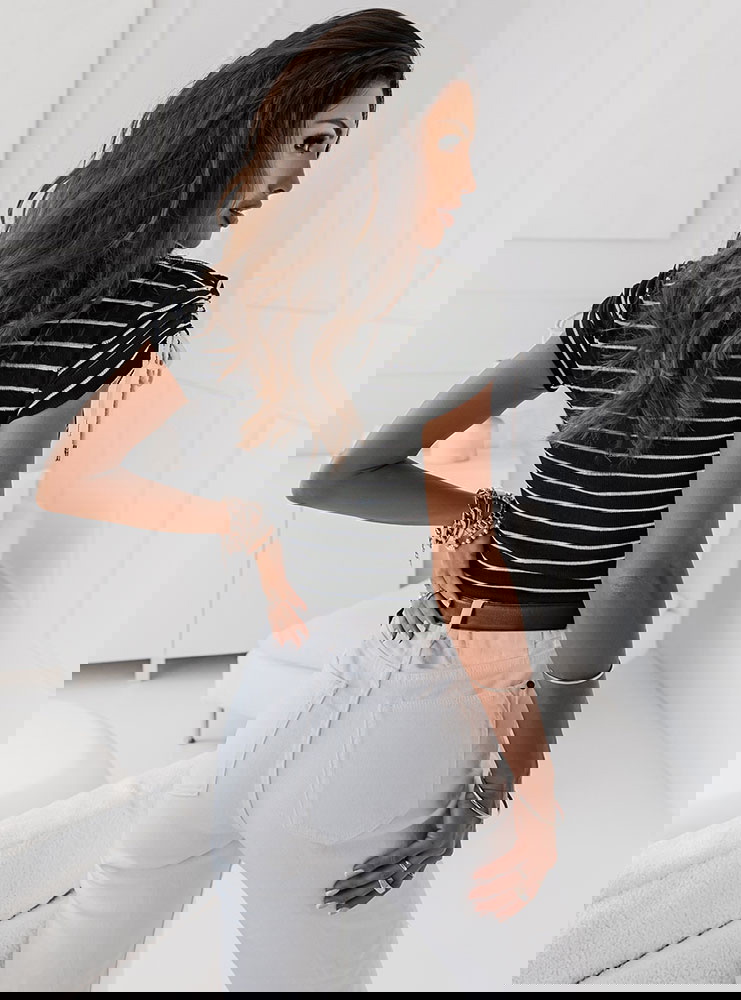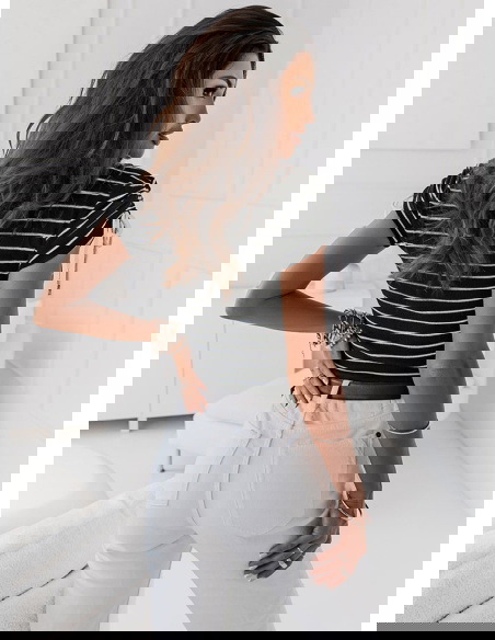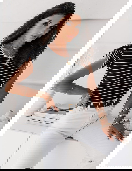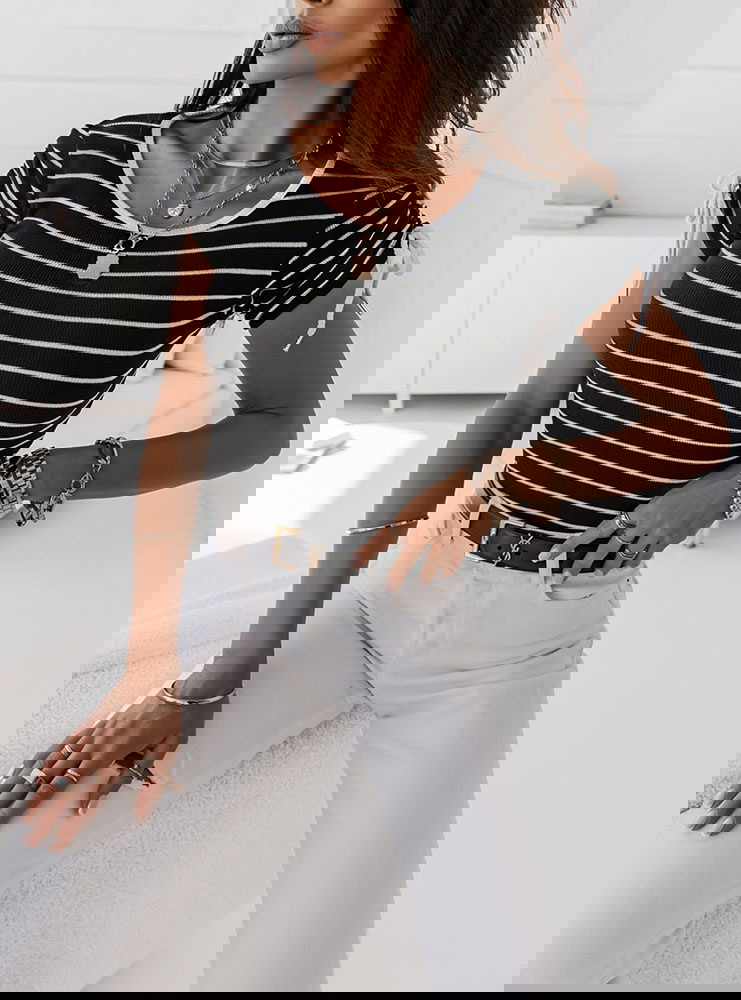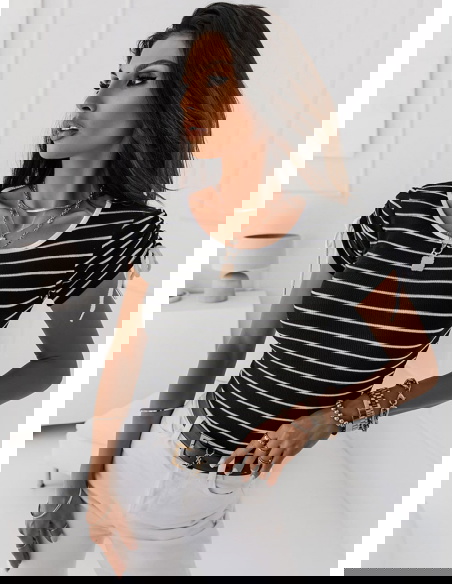 Czarna prążkowana bluzka w paski Sylien - wzór 1 połączenie kolorów białego i czarnego świetnie się prezentuje i dopasujesz do tej bluzki większość swojej garderoby dolnej.