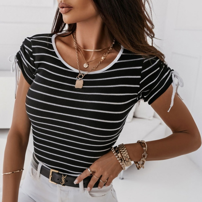 To czarna bluzka w paski z ozdobnym marszczeniem na rękawach. Oryginalne rękawy sprawią że będziesz wyglądała wyjątkowo. Nasza propozycja to hit nadchodzącego lata, paski są teraz bardzo rozchwytywane.