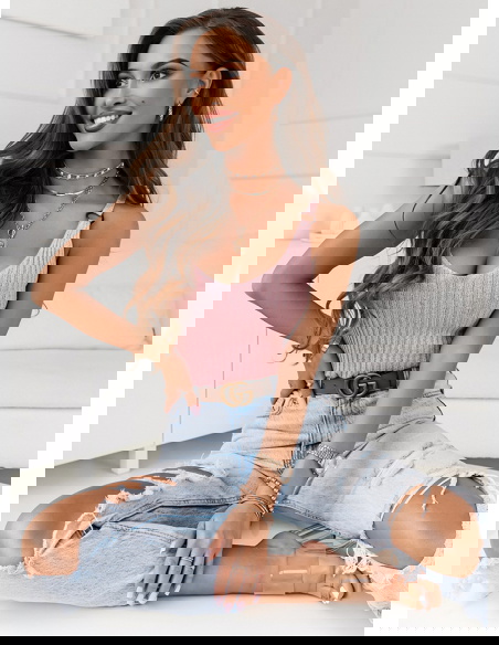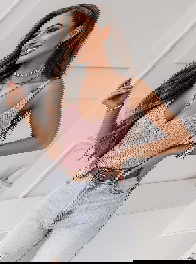 Pudrowa prążkowana bluzka na ramiączkach z ozdobnym kółkiem Chrisa będzie super wyglądała z ulubioną parą szortów lub spódniczką.
