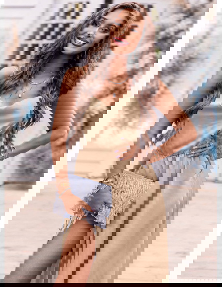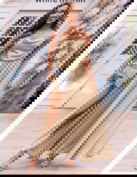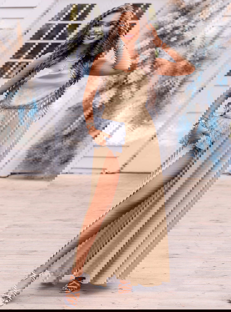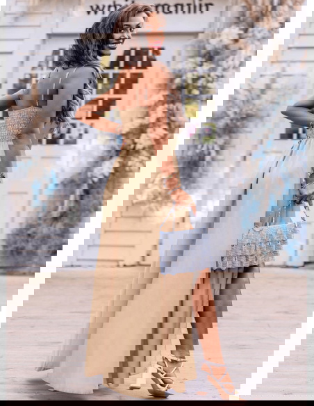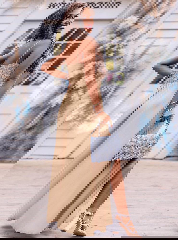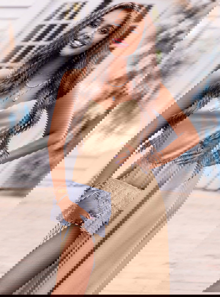 Beżowa satynowa sukienka z rozcięciem Cezza w połączeniu z małą torebką i szpilkami będziesz wyglądała nieziemsko. Modna na maxa!