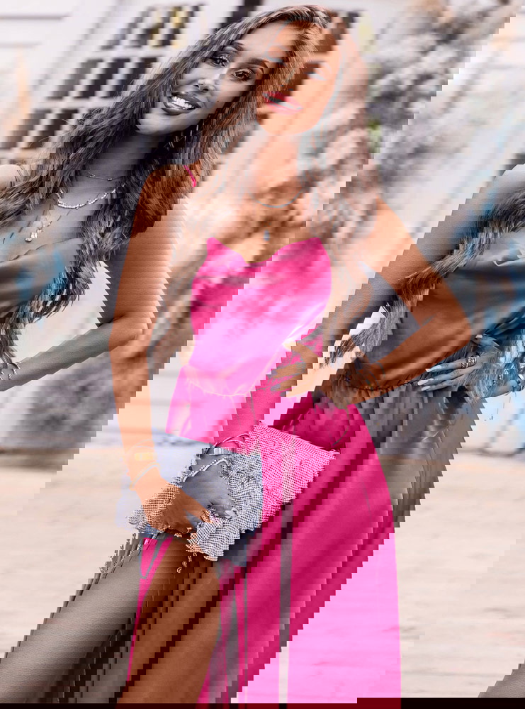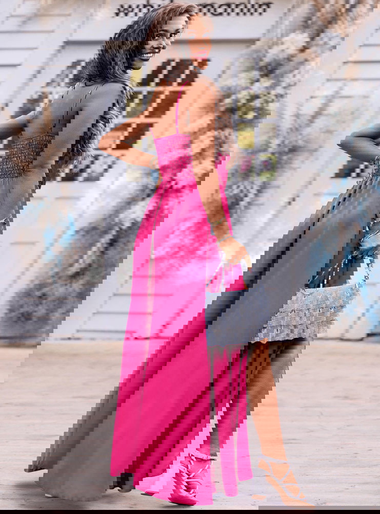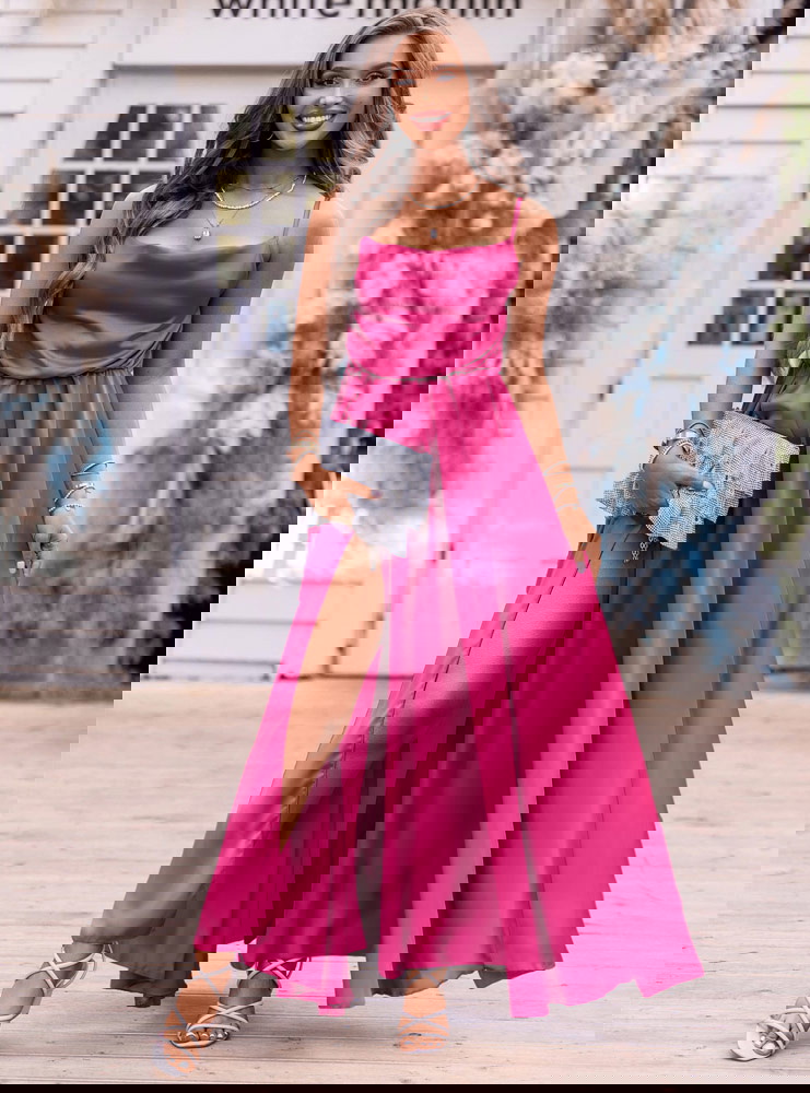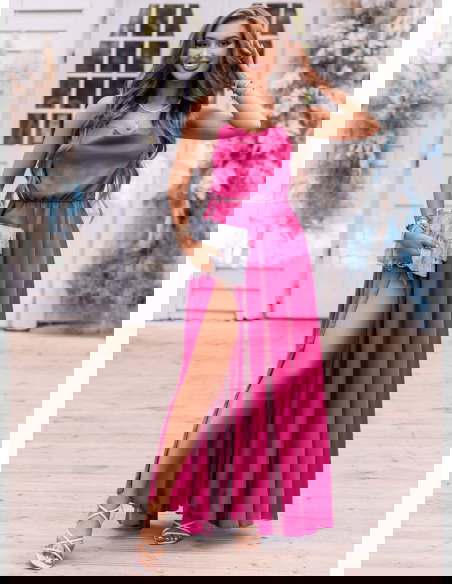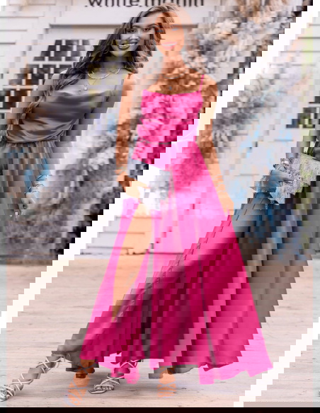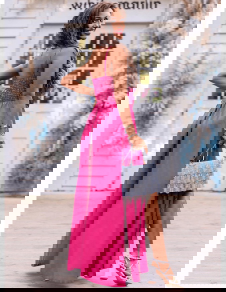 Satynowa sukienka z rozcięciem Cezza - fuksja idealnie się nada na takie okazje jak wesele, ślub, chrzciny.