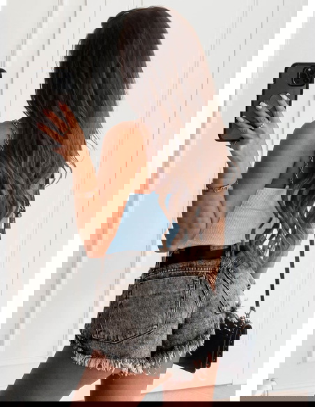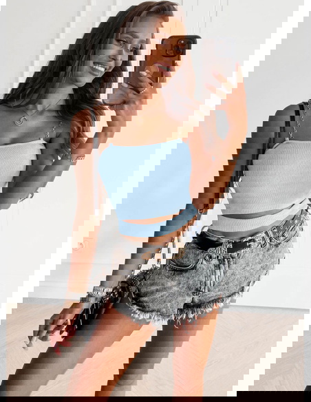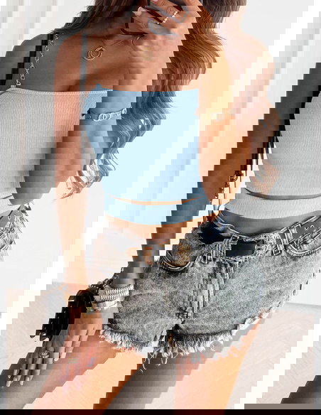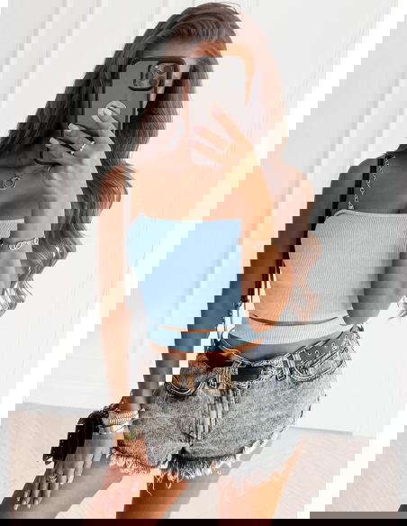 Bluzka w przepiękny błękitny kolorze to świetna propozycja na nie jedną stylizację tego lata. Taka bluzeczka będzie pięknie wyglądała napewno z szortami czy tez spódniczką. Ramiączka ze złotych łańcuszków dodatkowo sprawią że wyróżnisz się z tłumu.