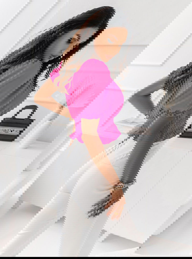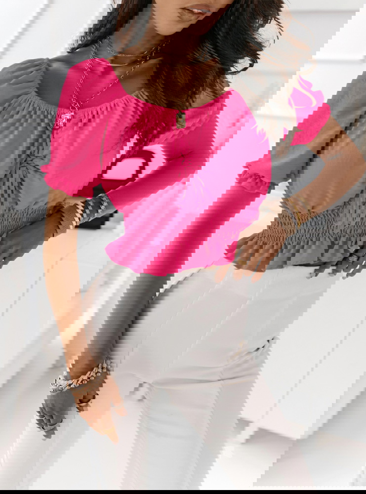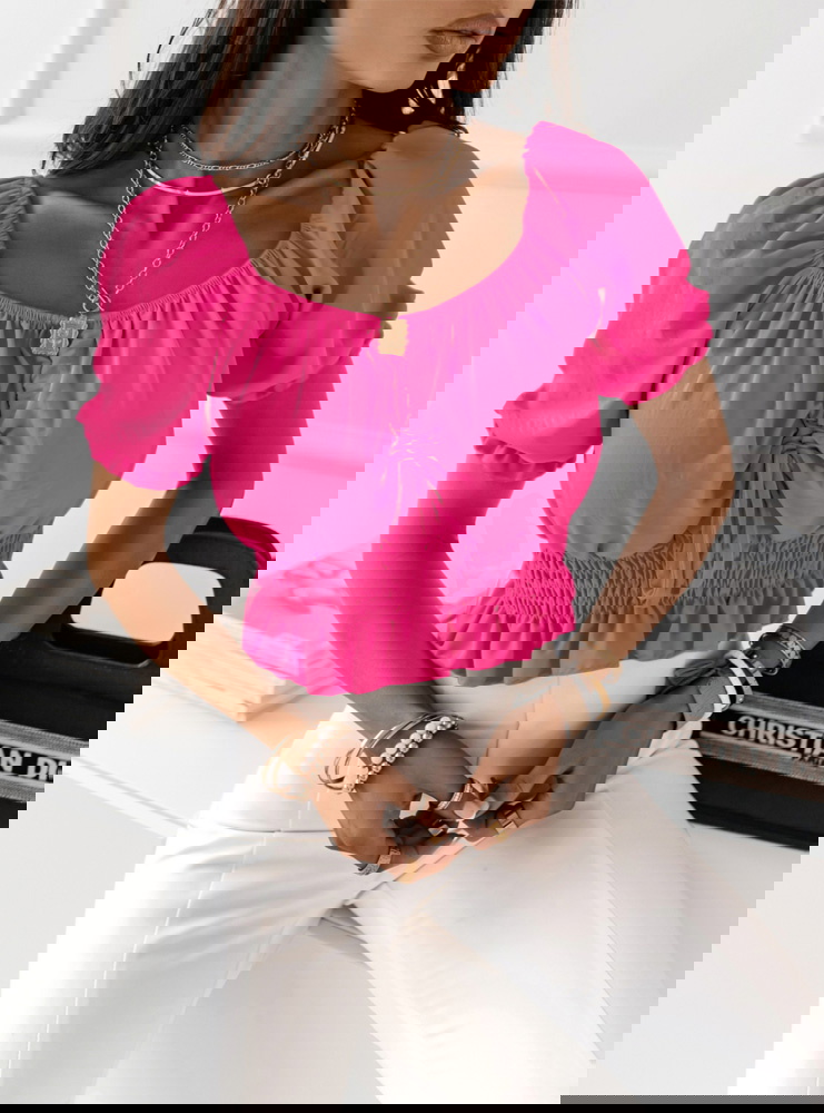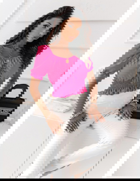 Bluzka typu crop top z marszczeniem na dekolcie Laberle - fuksja Marszczenie na dekolcie dodaje bluzce efektowności i unikalności, tworząc interesujący akcent wizualny i przyciągając wzrok.