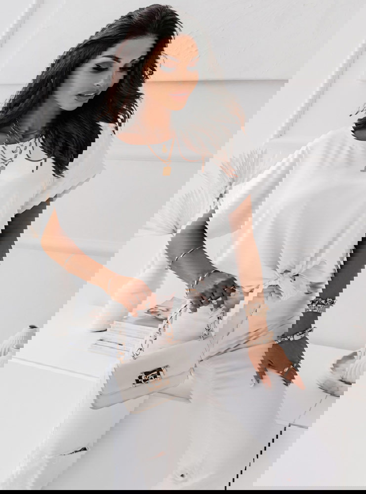 Biała bluzka z ozdobnym wiązaniem jest uroczym i eleganckim elementem garderoby, dodającym subtelności i kobiecego wdzięku do każdej stylizacji. Ozdobne wiązanie na białej bluzce nadaje jej unikalnego charakteru, przyciągając wzrok i dodając wyrafinowanego detalu.
