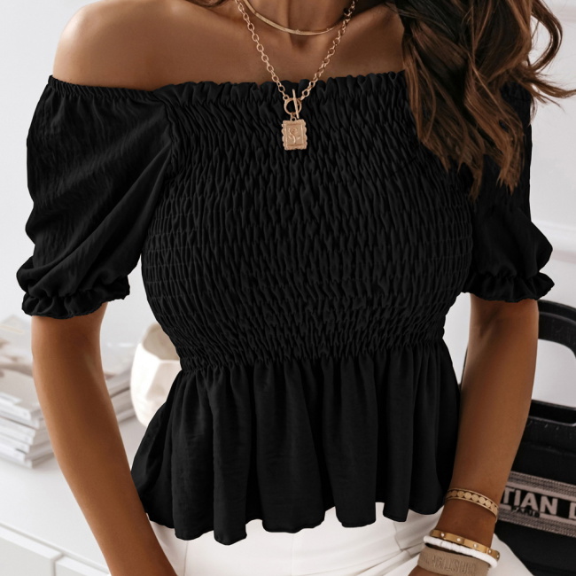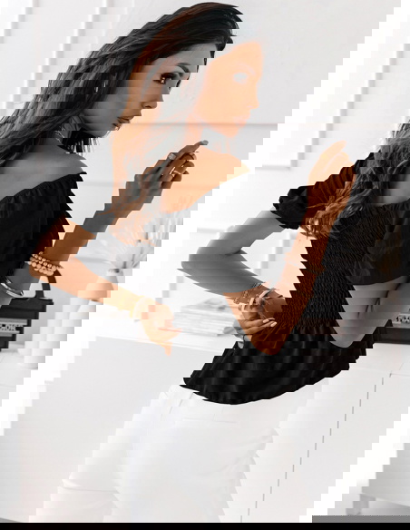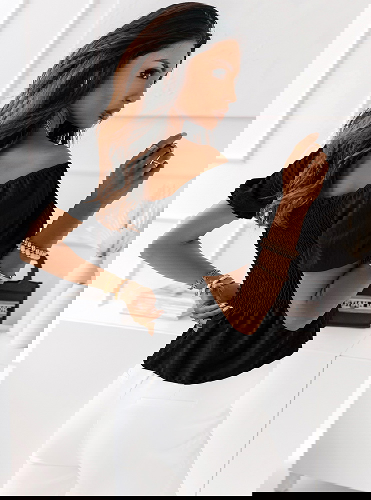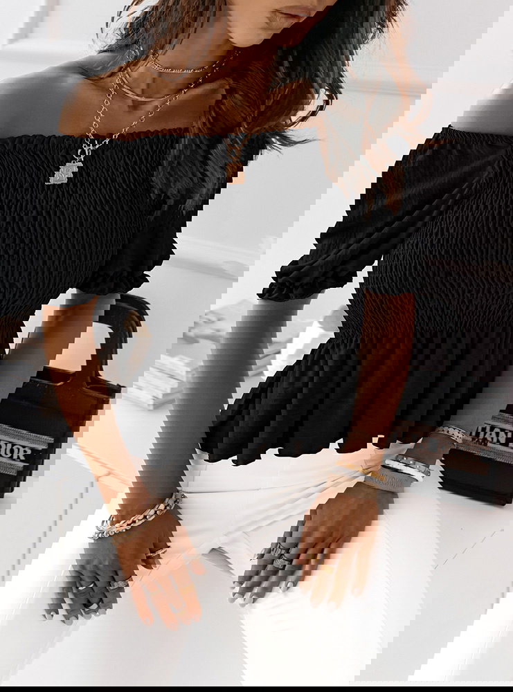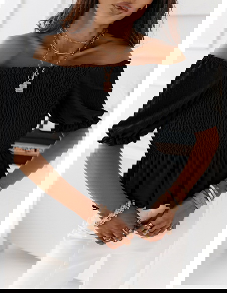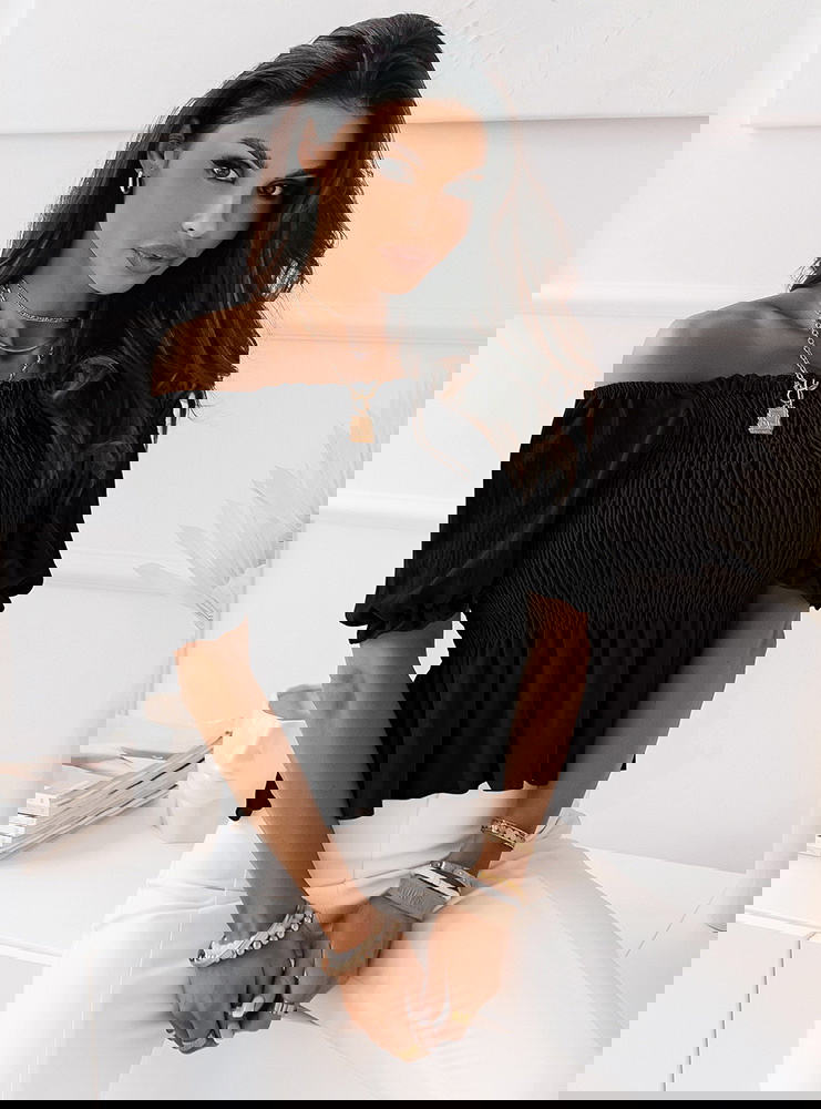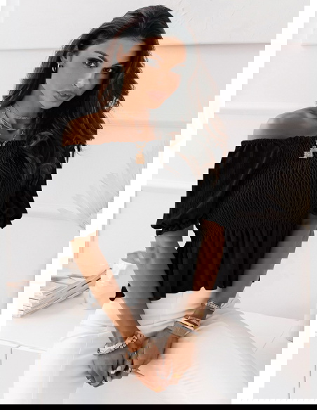 Czarna bluzka typu crop top z marszczeniem Elebie Czarna bluzka typu crop top z marszczeniem to odważny i stylowy element garderoby, który podkreśla sylwetkę i dodaje dziewczęcego uroku.