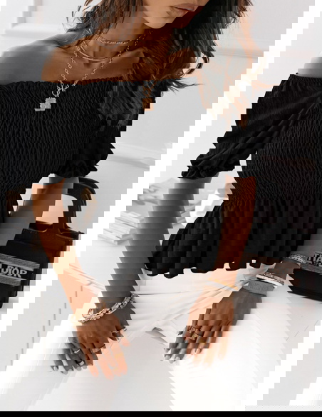 Marszczenie na czarnej bluzce typu crop top dodaje jej wyjątkowego charakteru, tworząc efektowny wzór i przyciągając wzrok. Ta czarna bluzka typu crop top z marszczeniem jest doskonała do tworzenia trendowych i zmysłowych looków, idealna na letnie imprezy i wieczorne wyjścia.