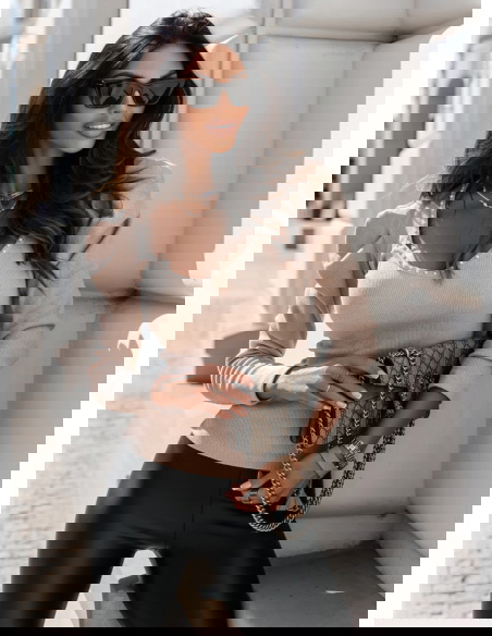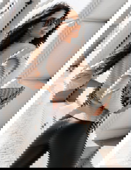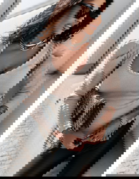 Beżowa prążkowana bluzka z dekoltem w serek i perełkami Tezzma