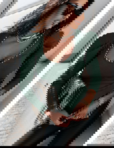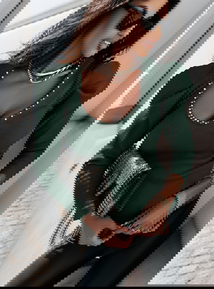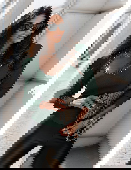Prążkowana bluzka z dekoltem w serek i perełkami Tezzma - butelkowa zieleń