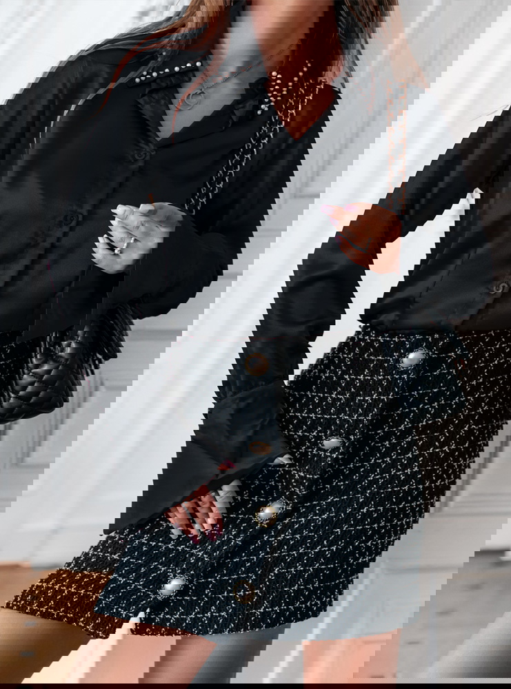 Czarna satynowa koszula zapinana na guziki z ozdobnymi perełkami na kołnierzu Clarity Wykonana z doskonałego materiału, zapewniająca komfort użytkowania i subtelny połysk. Ozdobne perełki na kołnierzu dodają koszuli ozdobnego uroku i klasy. Do uniwersalnych elementów, który sprawdził się zarówno w formalnych, jak i wyższych casualowych stylizacjach. Czarna satynowa kombinacja z wyjątkowymi perełkami to must-have w kolekcji każdej kobiety, która pragnie wyróżnić się w eleganckim stylu.