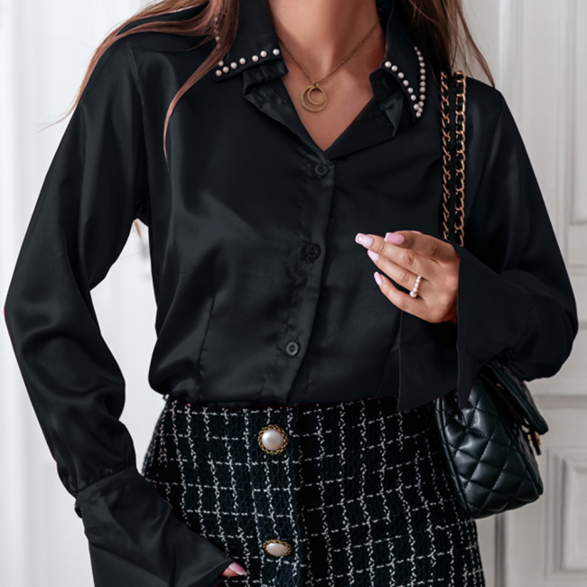 Czarna satynowa koszula zapinana na guziki z ozdobnymi perełkami na kołnierzu Clarity