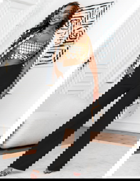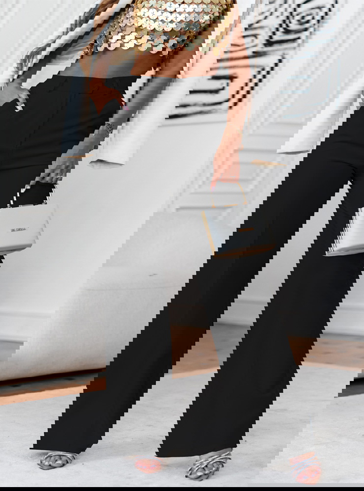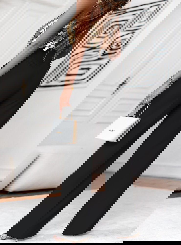 Czarne szerokie spodnie zapinane na guzik Moniliaa to elegancki i uniwersalny element garderoby, który doskonale sprawdza się na różne okazje. Czarny kolor nadaje spodniom klasycznego charakteru, co czyni je łatwym do zestawienia z różnymi bluzkami i dodatkami.Szerokie nogawki spodni podkreślają nowoczesny krój, który jest zarazem wygodny i stylowy, dając lekki efekt luźności.Spodnie zapinane na guzik zapewniają wygodne noszenie i dodają profesjonalnego wyglądu, odpowiednie zarówno do formalnych sytuacji, jak i casualowych.