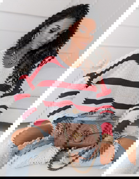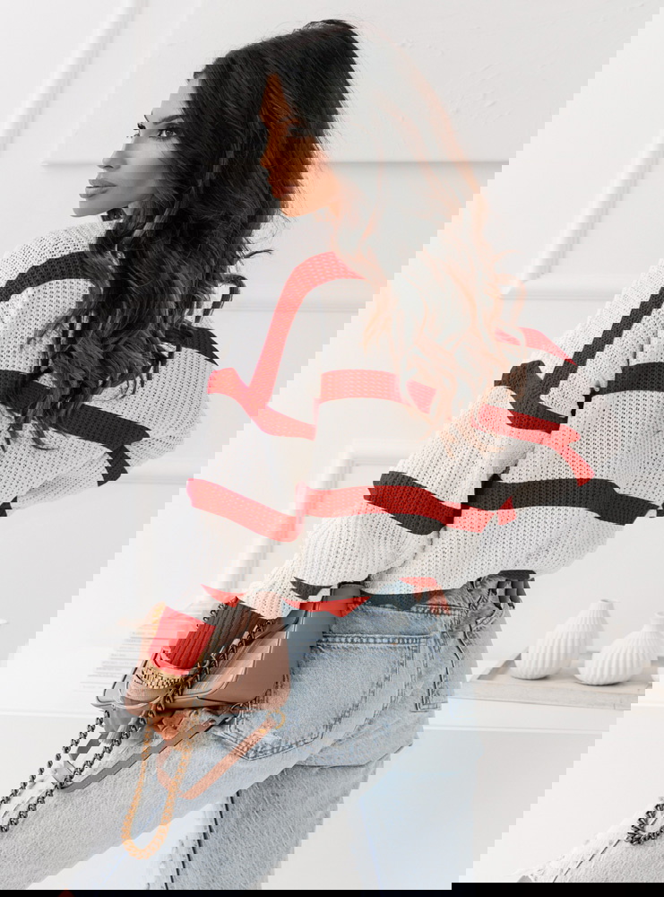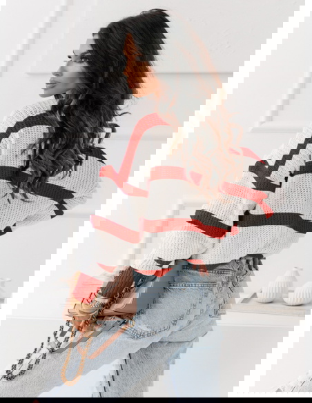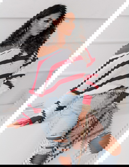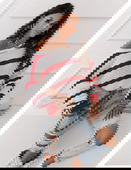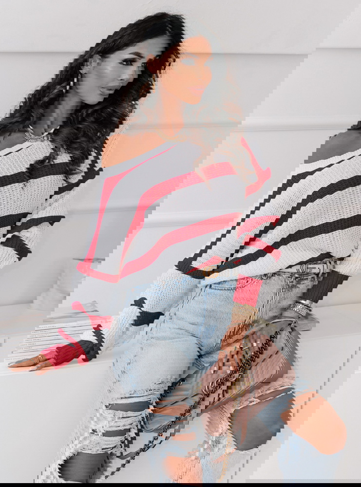 Sweter w paski Claudette - wzór 1 To modna propozycja dla osób ceniących prostotę i elegancję, tworzącą harmonijną i stylową stylizację.