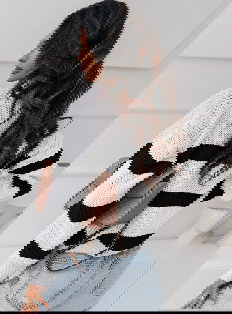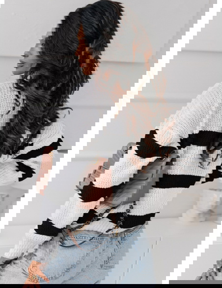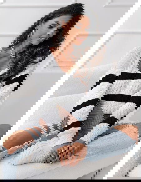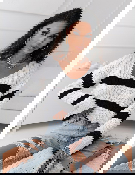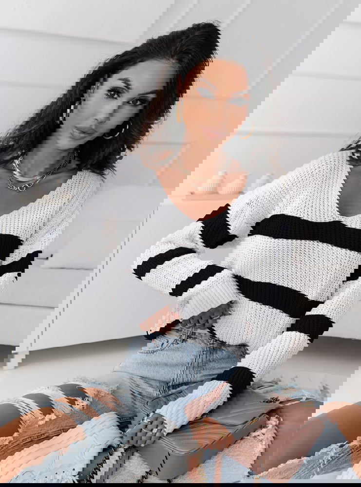 Sweter w paski z dekoltem V Ojella to modny i stylowy element garderoby, który wyróżnia się kontrastowym wzornictwem pasków oraz eleganckim dekoltem w kształcie litery V. Wykonany z wysokiej jakości materiałów, sweter jest miękki i przyjemny w dotyku, zapewniając wygodę i ciepło w chłodniejsze dni. Jego wzór w postaci pasków dodaje swetrowi charakteru i dynamiki, podczas gdy dekolt V nadaje mu subtelnej elegancji.